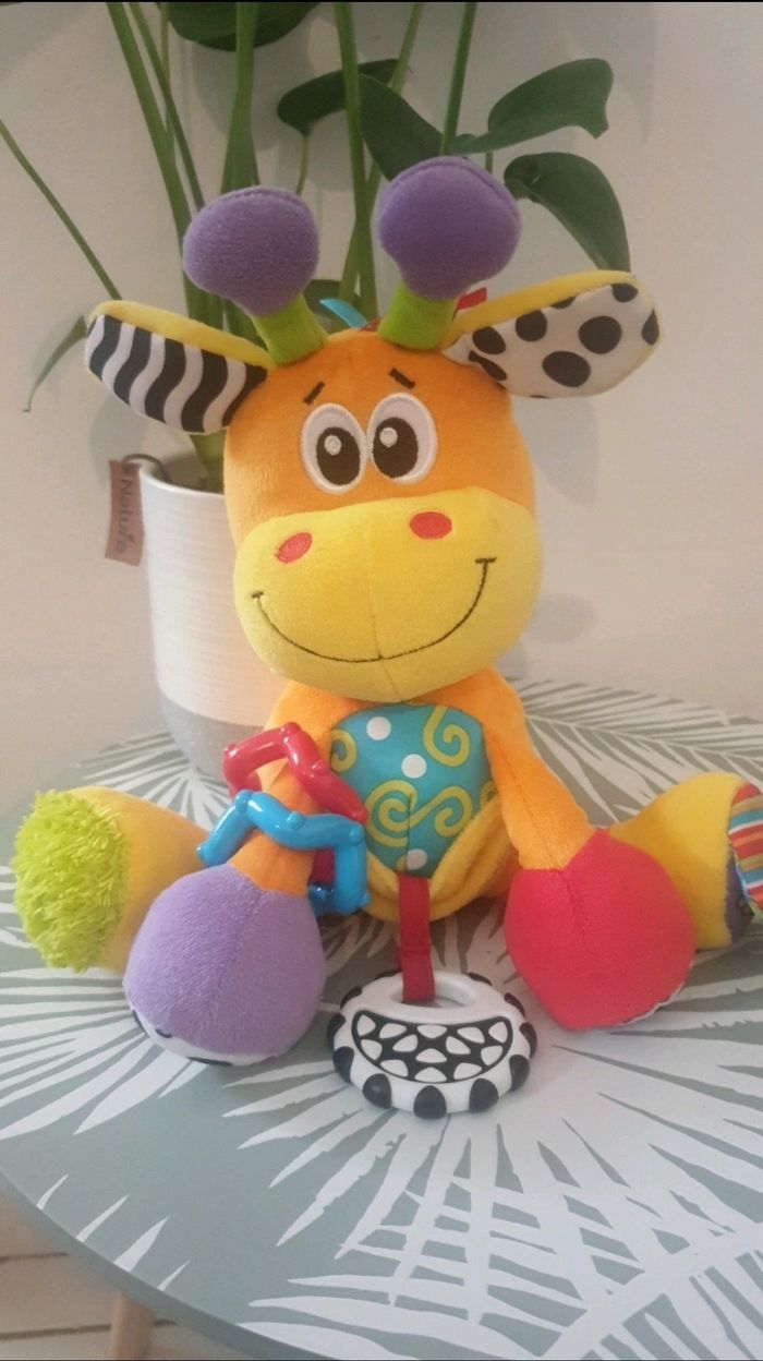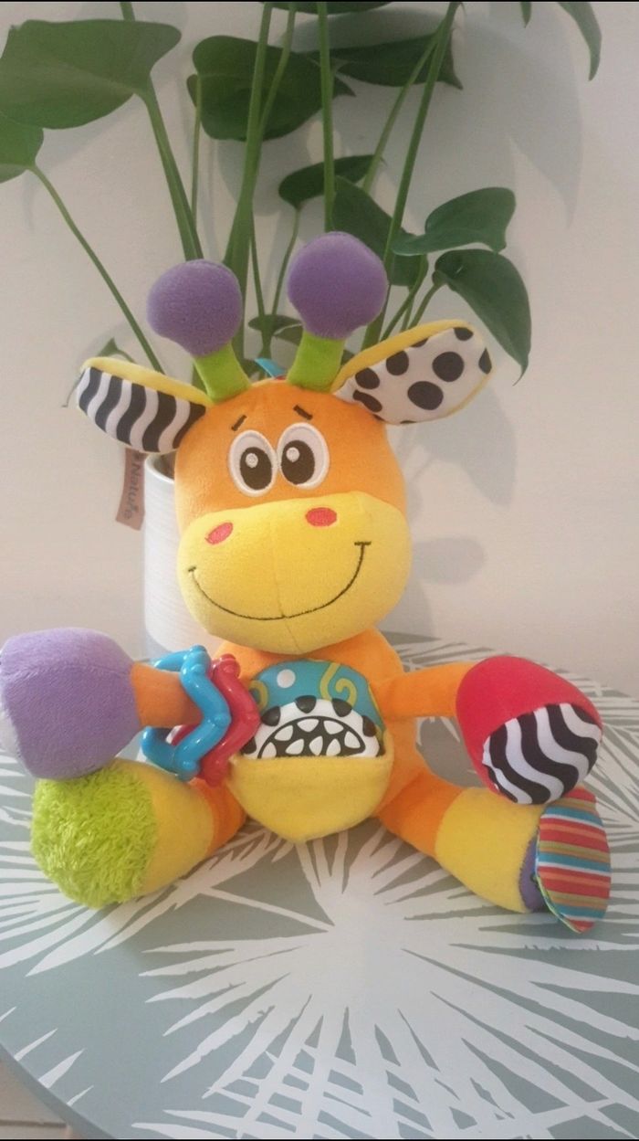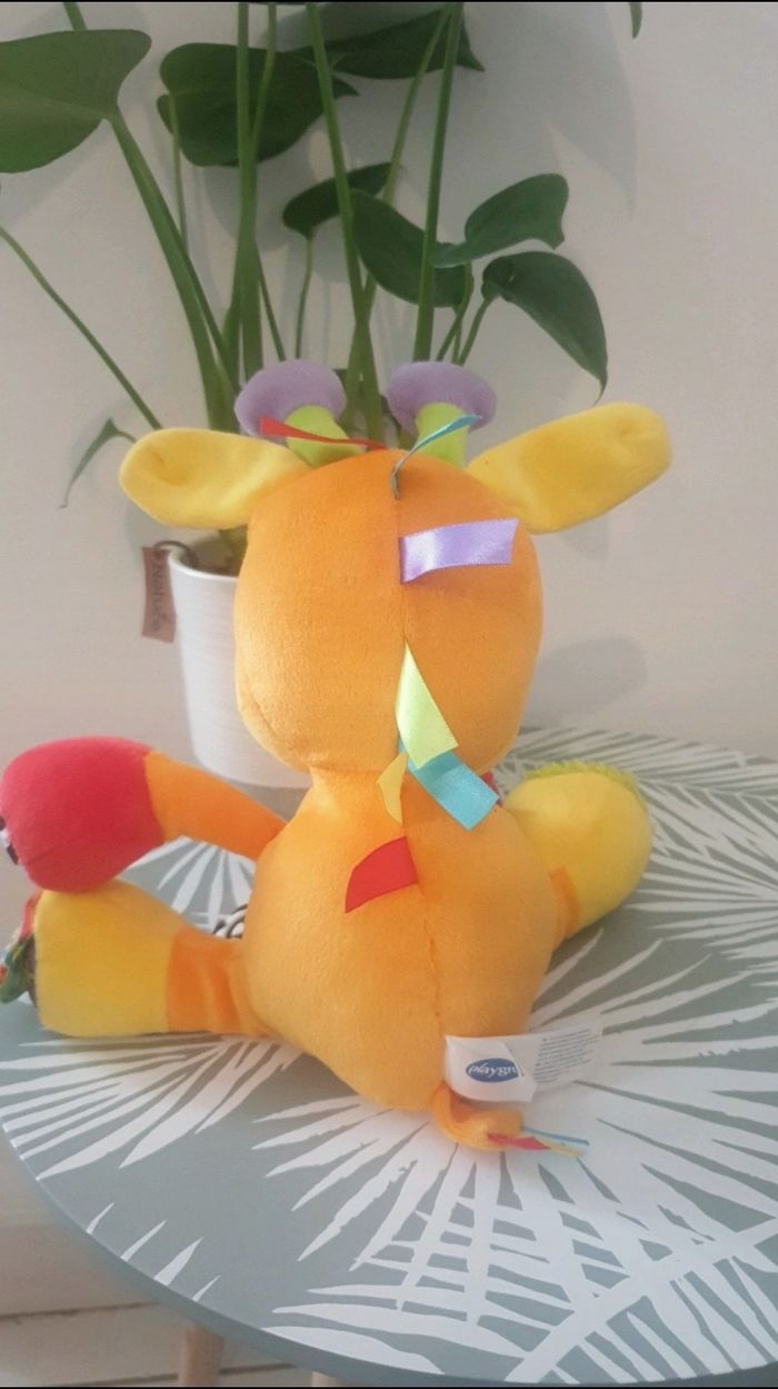 Peluche girafe sensorielle qui fait bruits, textures avec anneaux de dentition et gencives. Idéal pour l'éveil acheter 28€.
