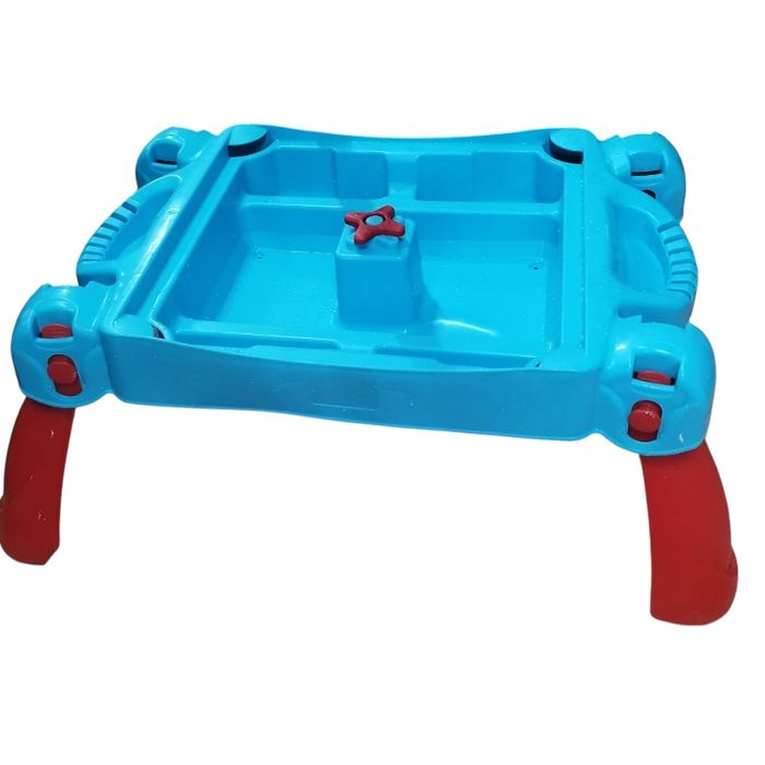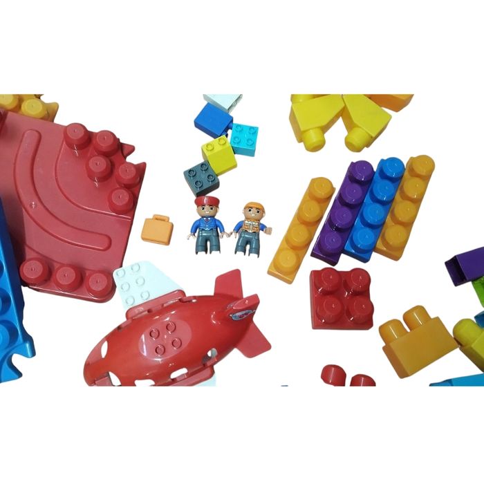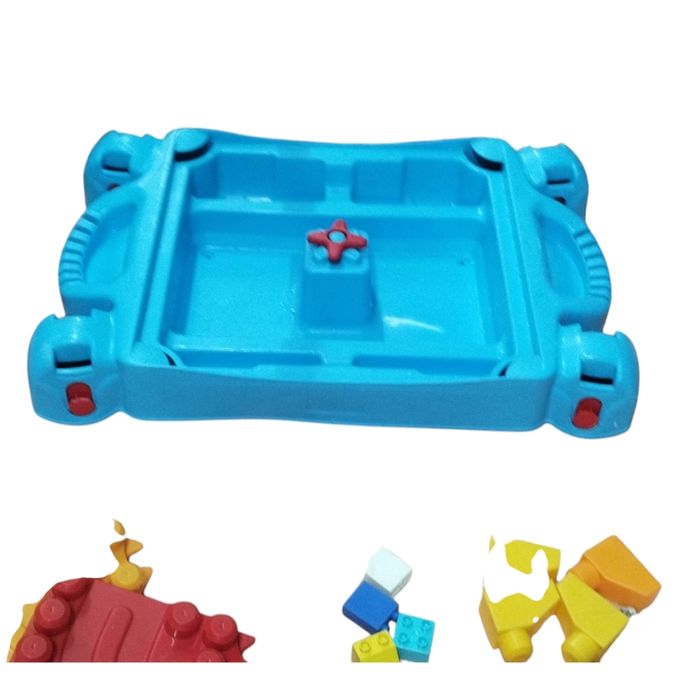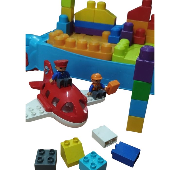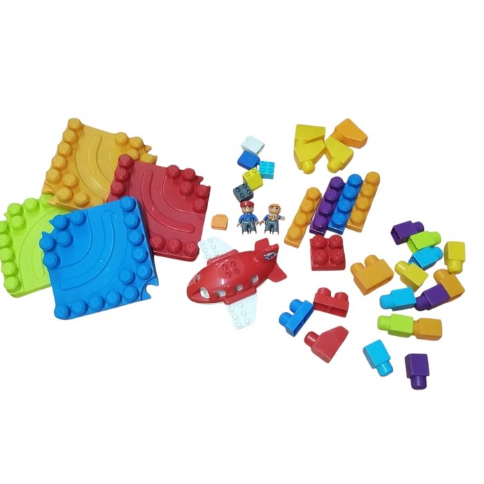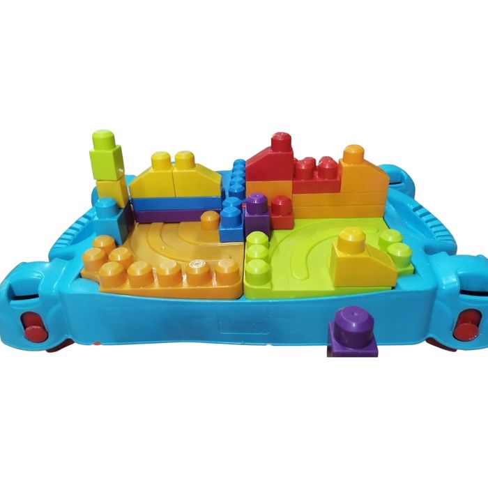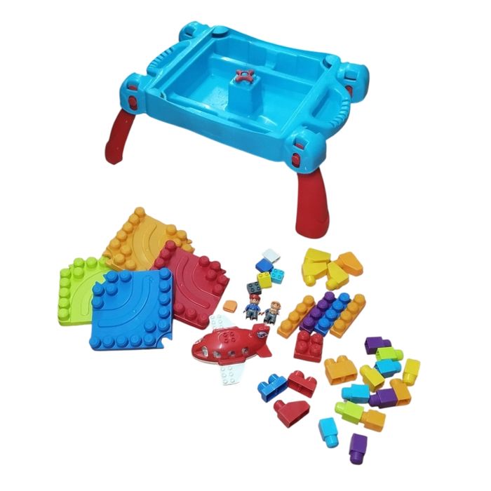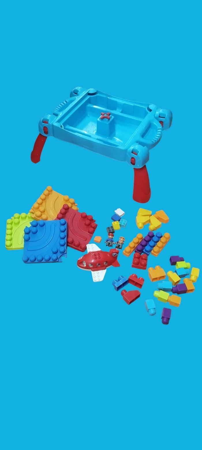 Table de jeux Megabricks pour bebe de 0 à 3 ans. Modulable en hauteur grâce aux 4 pièces repliables. Jeux d'extérieur et/ou intérieur. Les 30 à 40 pièces de jeux de construction grands formats idéal pour les petits mains peuvent se ranger dans la table grâce aux 4 panneaux de fermeture sur le dessus (qui servent également de base de construction). + 2 personnages +1 avion