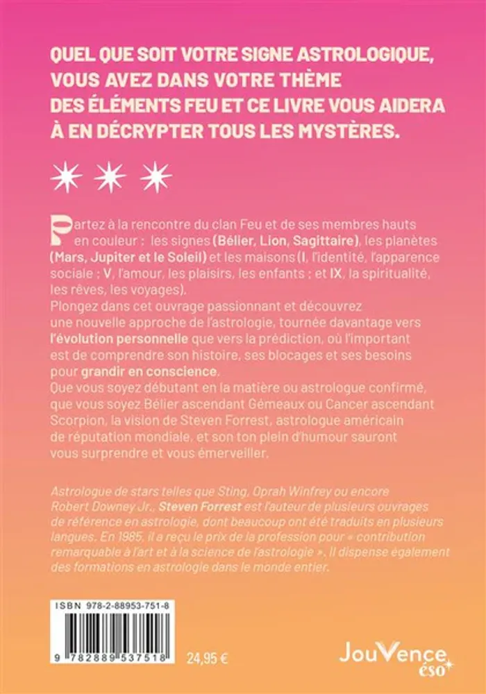 uel que soit votre signe astrologique, vous avez dans votre thème des éléments feu et ce livre vous aidera à en décrypter tous les mystères. Partez à la rencontre du clan Feu et de ses membres hauts en couleur : les signes (Bélier, Lion, Sagittaire), les planètes (Mars, Jupiter et le Soleil) et les maisons (I, l’identité, l’apparence sociale ; V, l’amour, les plaisirs, les enfants ; et IX, la spiritualité, les rêves, les voyages). Plongez dans cet ouvrage passionnant et découvrez une nouvelle approche de l’astrologie, tournée davantage vers l’évolution personnelle que vers la prédiction, où l’important est de comprendre son histoire, ses blocages et ses besoins pour grandir en conscience. Que vous soyez débutant en la matière ou astrologue confirmé, que vous soyez Bélier ascendant Gémeaux ou Cancer ascendant Scorpion, la vision de Steven Forrest, astrologue américain de réputation mondiale, et son ton plein d’humour, sauront vous surprendre et vous émerveiller.