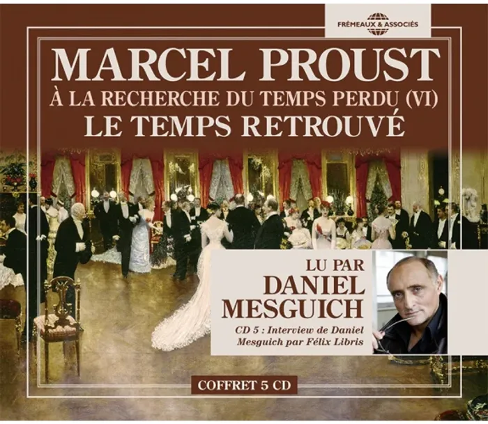 Pour la première fois, un éditeur, Frémeaux & Associés, présente l’essentiel de l’oeuvre de Marcel Proust à travers une écoute choisie d’À la recherche du temps perdu. La quintessence du chef-d’oeuvre de Marcel Proust est ici sélectionnée avec soin et finesse par Paul Desalmand puis transmise, avec une justesse et une maîtrise de la langue remarquables, par Daniel Mesguich qui met tout son talent au service de la beauté et du sens du texte. Un voyage au coeur de cette oeuvre immense et grandiose dans laquelle Marcel Proust peint avec précision et subtilité les circonvolutions de la psychologie humaine. Le temps retrouvé. Dans un Paris assombri par les feux de la guerre, la mondanité poursuit son cours. C’est un Paris pourtant métamorphosé que redécouvre le Narrateur. Ses amis, plus vieux et ridicules que jamais, sont devenus méconnaissables. La vieillesse est ici la cause de ces changements. Elle n’épargne pas le Narrateur, dont les vertiges et les questionnements face à l’épaisseur du temps passé retentissent à travers la voix de Daniel Mesguich. Afin de clore la série des enregistrements d’À la recherche du temps perdu, Frémeaux & Associés est fier de proposer, en bonus de ce coffret, l’interview exclusive de Daniel Mesguich par Félix Libris sur l’Art de la lecture. Claude COLOMBINI FRÉMEAUX This 5 CD set delivers a selection of Marcel Proust's novel "Time Regained" the seventh and last volume of "A la recherche du temps perdu" ("In Search of Lost Time"). This masterpiece of French literature is read by famous actor Daniel Mesguich, the fifth CD is an interview of the actor. Audiobook in French. PRODUCTION : CLAUDE COLOMBINI FRÉMEAUX POUR FREMEAUX & ASSOCIES EN ACCORD AVEC LA SCPP. DROITS : GROUPE FREMEAUX COLOMBINI