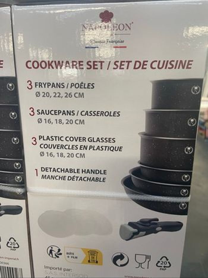 Batterie de cuisine Napoleon neuf 10pcs sans pfoa,compatible tous feux y compris induction,3 poêles,3 casseroles,3 couvercles en plastique et une poignée amovible,tres grande marque de cuisine française,tres bonne qualité,vendu 139€ en magasin