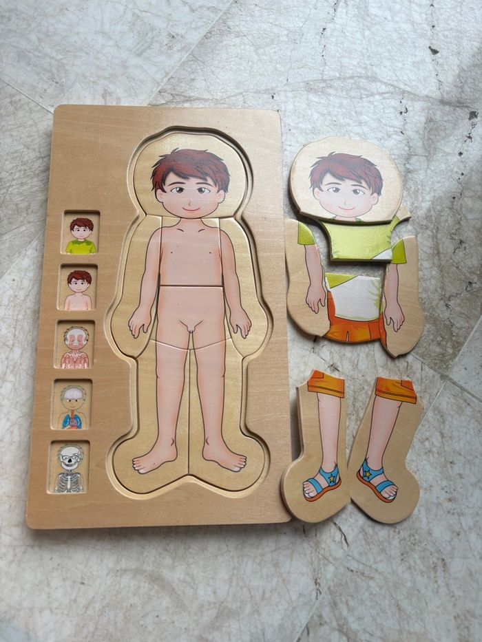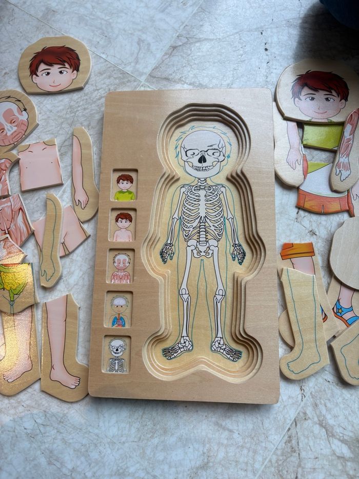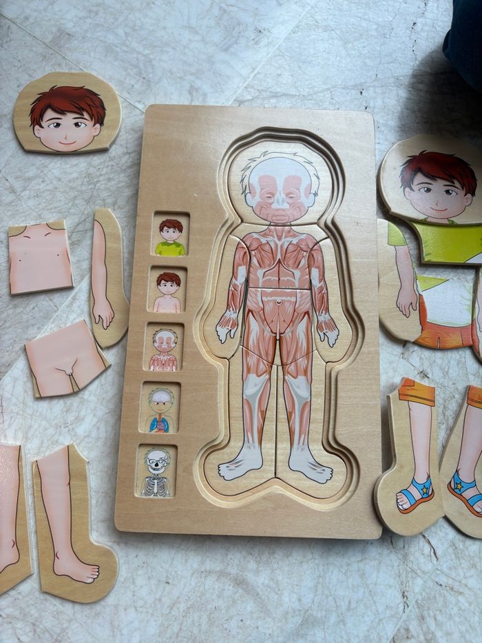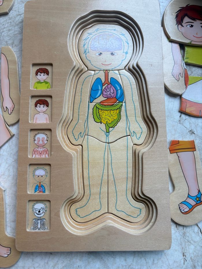 Puzzle en bois du corps humain complet et très instructif avec 4 puzzles pour chaque partie. Les pièces ont des formes différentes, l’enfant peut se corriger seul.