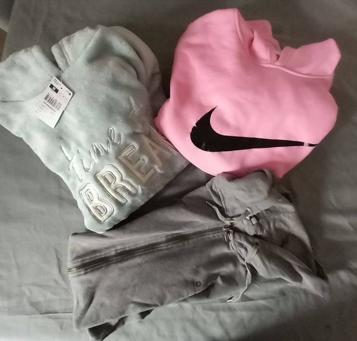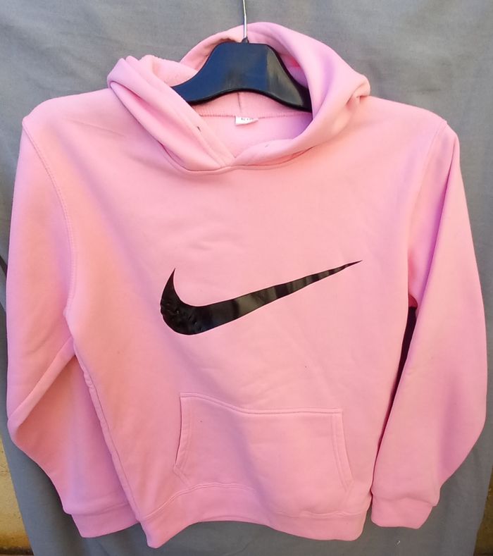 - Sweat rose à capuche, dessin imprimé, manque cordon de serrage à la capuche, poches devant, bas de manche et de sweat resserrés, largeur épaules 45 cm - aisselles 51 cm, longueur épaule-bas = 63 cm et aisselle-bas = 42cm, longueur manches 62 cm