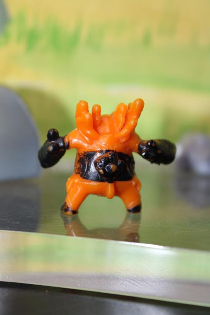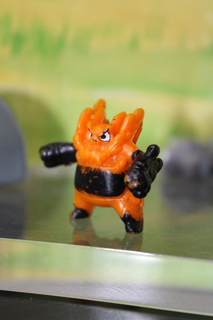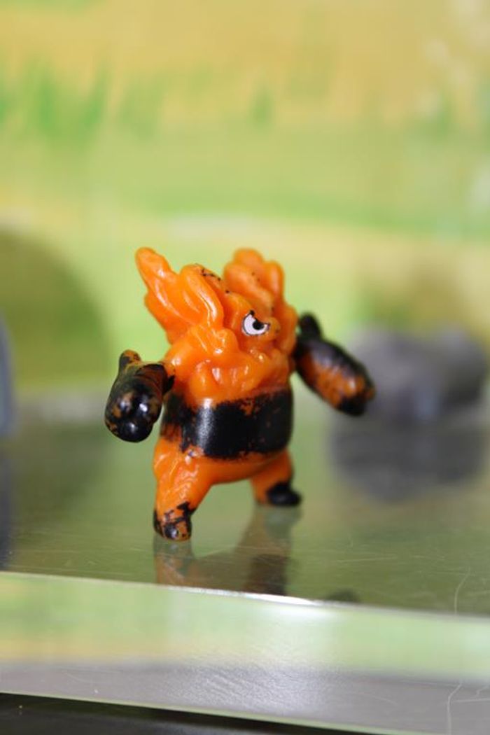 Figurine représentant Roitiflam un pokemon de 5 ème génération du monde de Unys Roitiflam est un Pokémon bipède et corpulent à l'allure porcine. Il a un groin rouge, d'épais sourcils noirs et deux défenses sortant de sa mâchoire inférieure. Des flammes constamment embrasées recouvrent son cou et ses épaules. Il a de petites jambes et d'épais bras. Le haut de ses bras est de couleur orange tandis que son bassin et la partie supérieure de ses jambes sont de couleur rouge. La partie inférieure de tous ses membres est noire avec une bande jaune séparant les deux couleurs les formant ; cette bande est droite sur ses bras et en dents de scie sur ses jambes. Il a également une bande rouge autour de chaque poignet et des touffes de fourrure sur les coudes. Ses mains se terminent par trois griffes blanches tandis que ses jambes n'en ont que deux. Une grande bande horizontale recouvre son ventre et son dos et est ornée d'arabesques jaunes. Sa queue courte et noire se termine par une touffe de fourrure. Taille environ 2/3 cm Marque : PK china En très bon état Réponds avec plaisir aux demandes d'informations complémentairre Réponse rapide envoi soigné dans les meilleurs délais