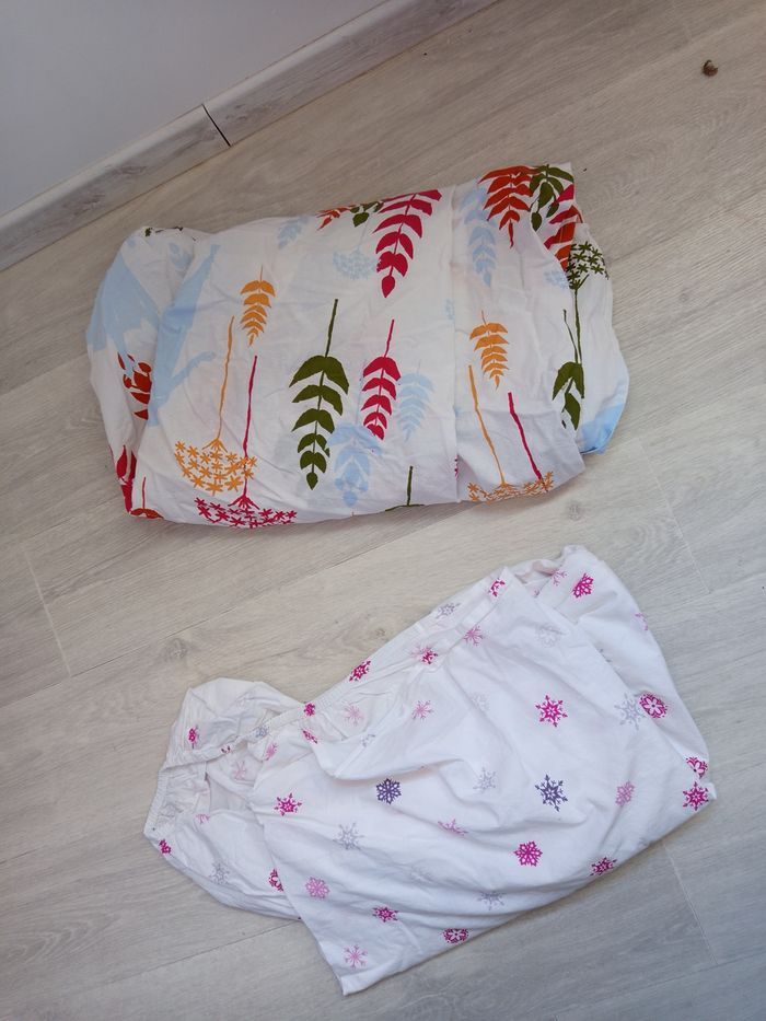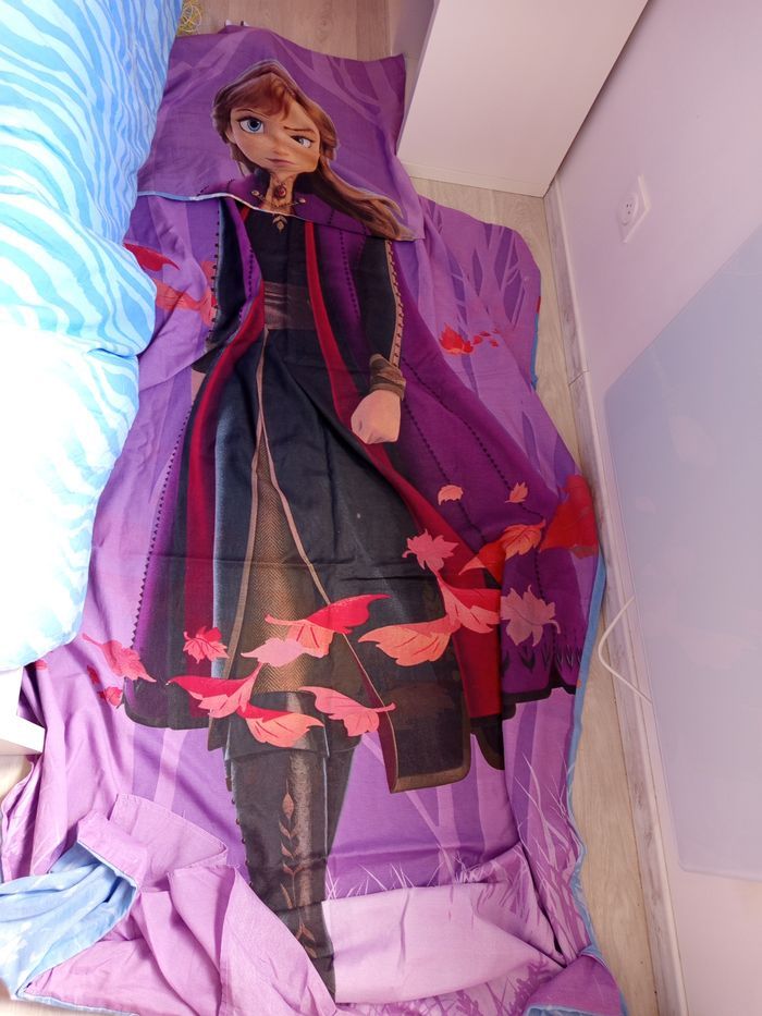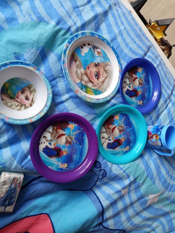 Vends au lot énormément de choses reine des neiges plaid , oreiller , assiettes , housse de couette et drap housse...