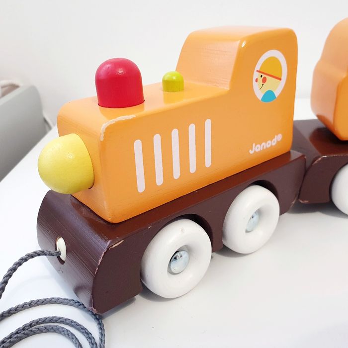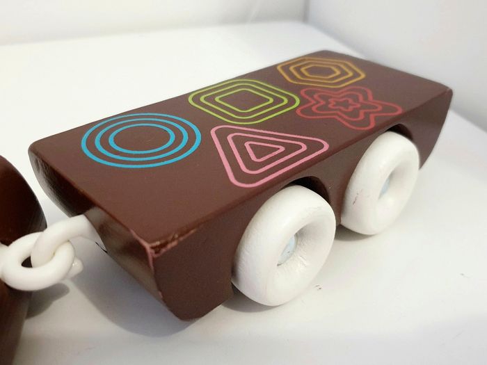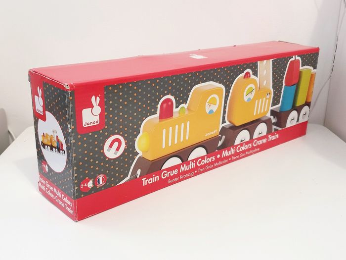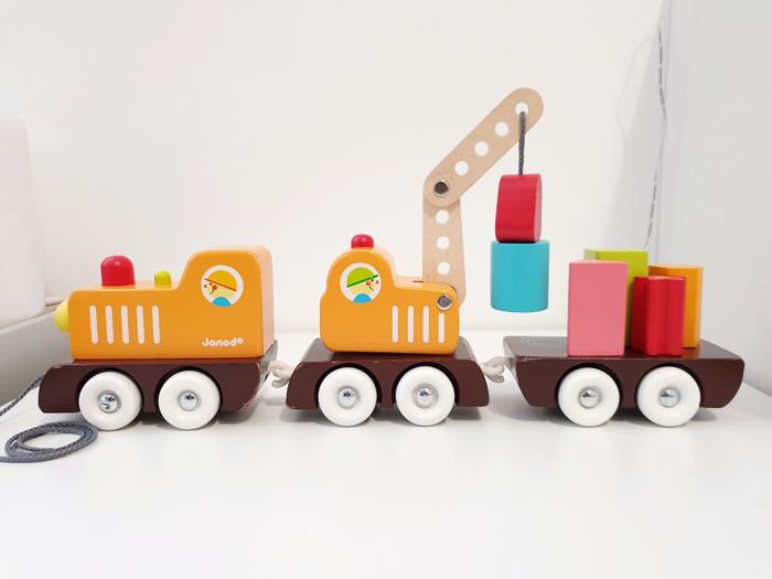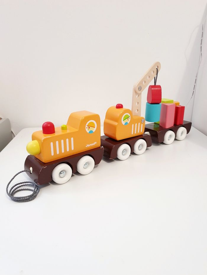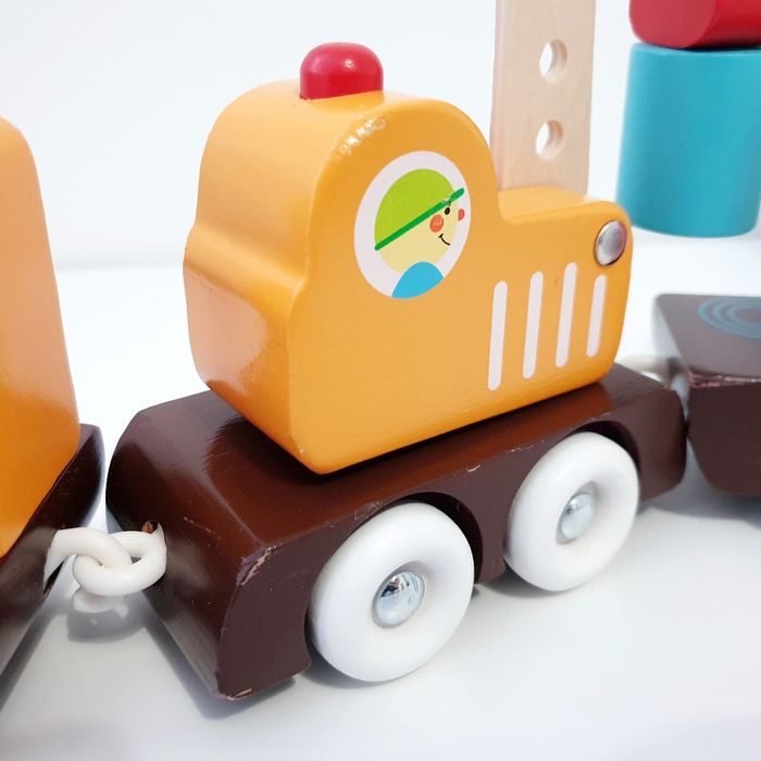 Train grue multicolore en bois composé d'une locomotive, d'un wagon grue rotative et d'un wagon de marchandise avec 5 blocs de formes différentes magnétiques.