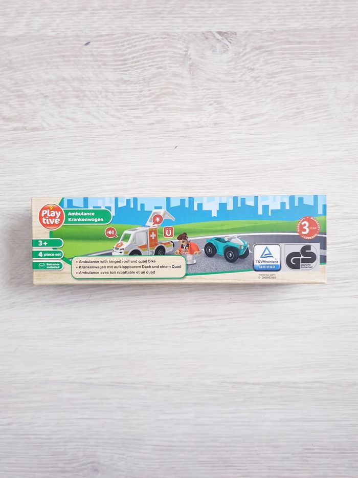 Ambulance avec toit ouvrant et un quad. Avec 2 figurines de jeu. Tous les véhicules avec embrayages magnétiques. 4 pièces. Avec effets sonores et lumineux.