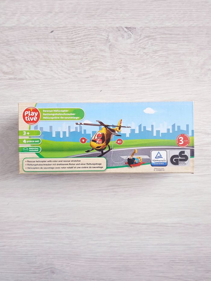 Hélicoptère de sauvetage avec rotor pivotant et une civière de sauvetage. Avec 2 figurines de jeu. Tous les véhicules avec attelages magnétiques. 4 pièces.