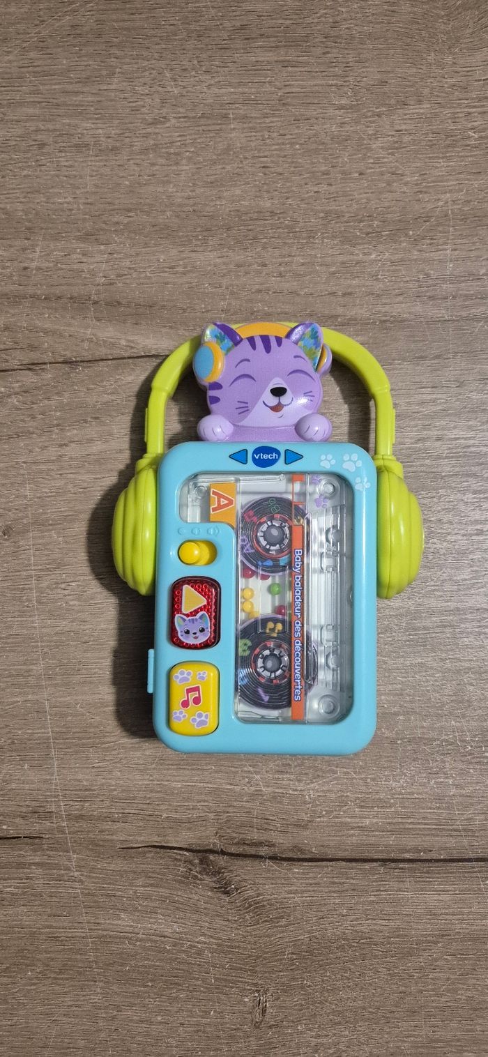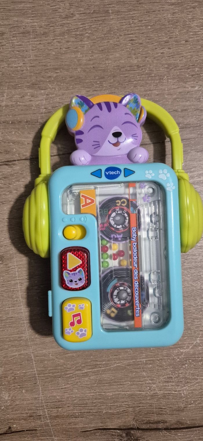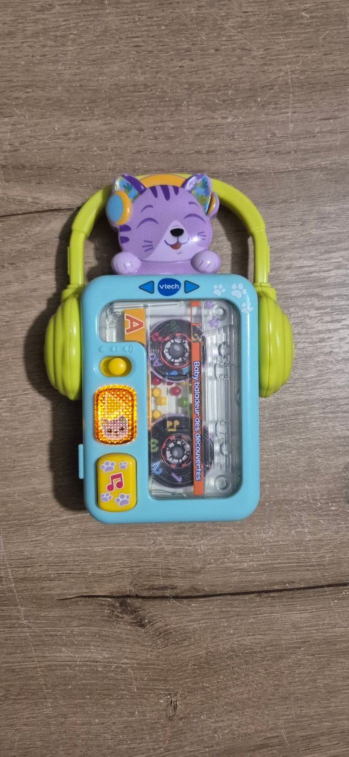 Baladeur au look vintage avec une bobine intégrée pour apprendre en musique Le bouton lecture déclanche des chansons, mélodies, sons et phrases rigolotes 3 chansons, 18 mélodies et 3 styles musicaux (classique, rock et jazz) La bobine tourne et fait bouger les billes multicolores, et le chat bouge Vtech Parfait état