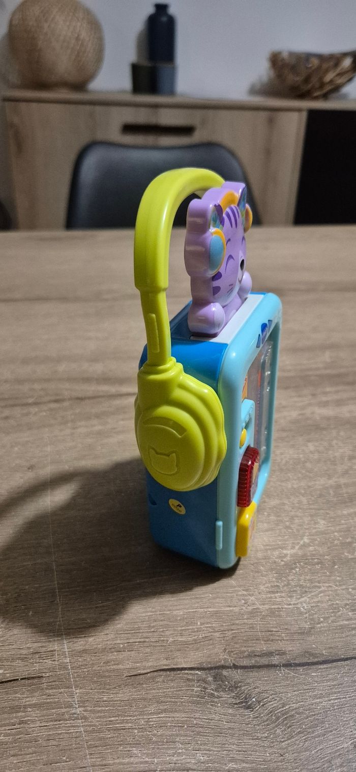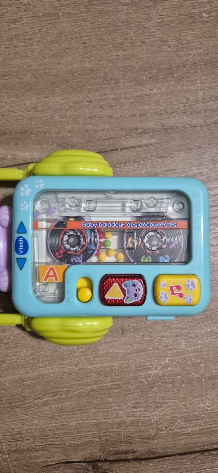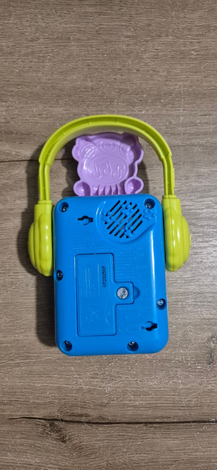 Baladeur au look vintage avec une bobine intégrée pour apprendre en musique Le bouton lecture déclanche des chansons, mélodies, sons et phrases rigolotes 3 chansons, 18 mélodies et 3 styles musicaux (classique, rock et jazz) La bobine tourne et fait bouger les billes multicolores, et le chat bouge Vtech Parfait état