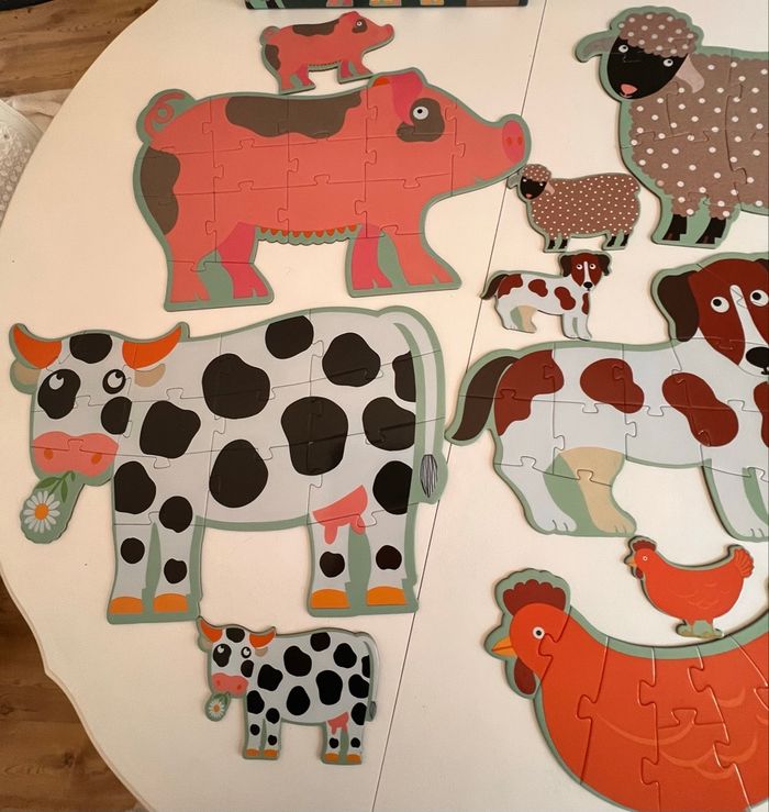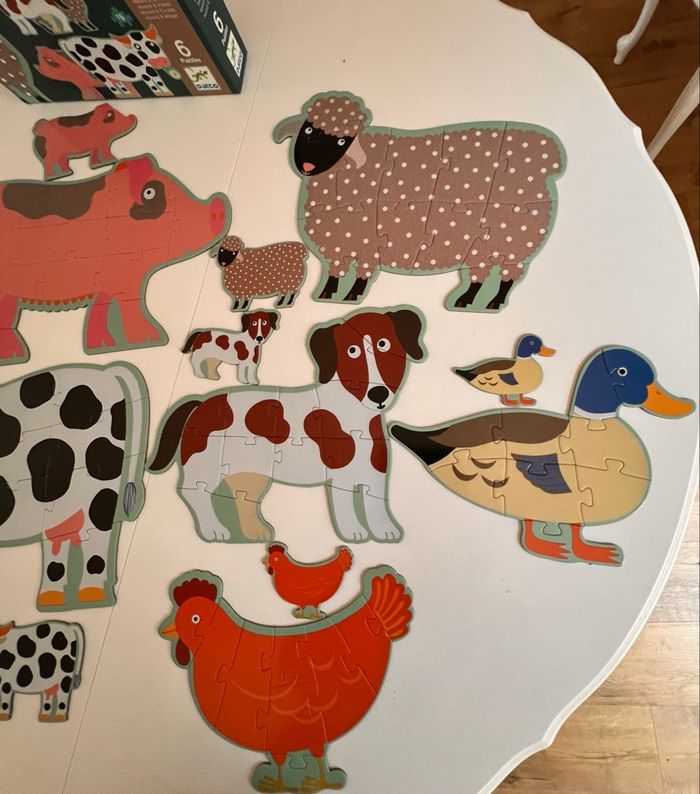 6 Puzzles maxi géant Honoré & ses amis Djeco évolutive Nombre de pièces : 9, 12 et 15 pièces Matériaux : carton épais, Thème : animaux de la ferme • Conditionnement : boîte rigide • Favorise : développement de la logique, coordination œil-main, concentration