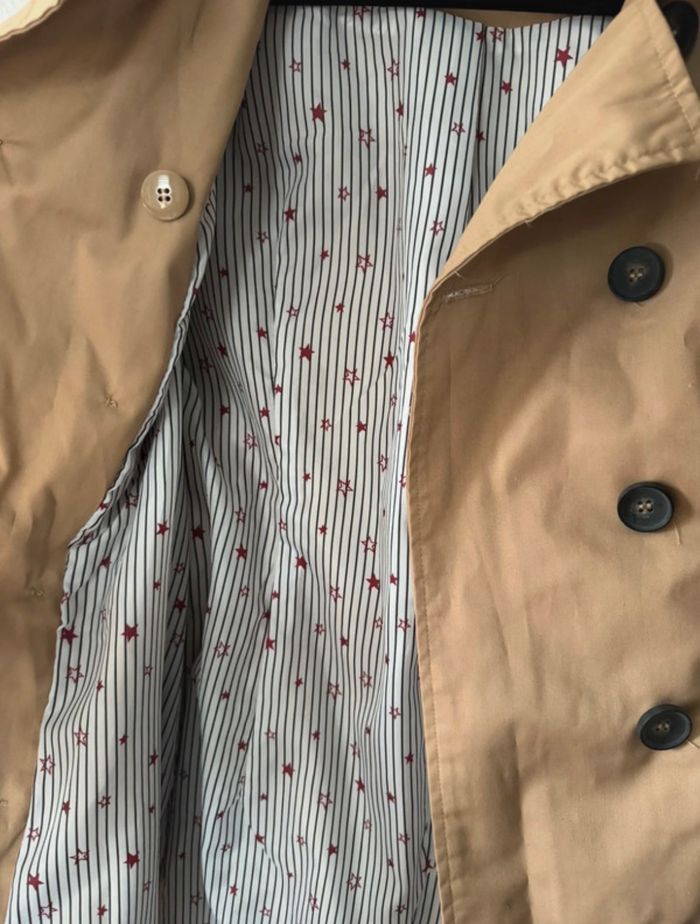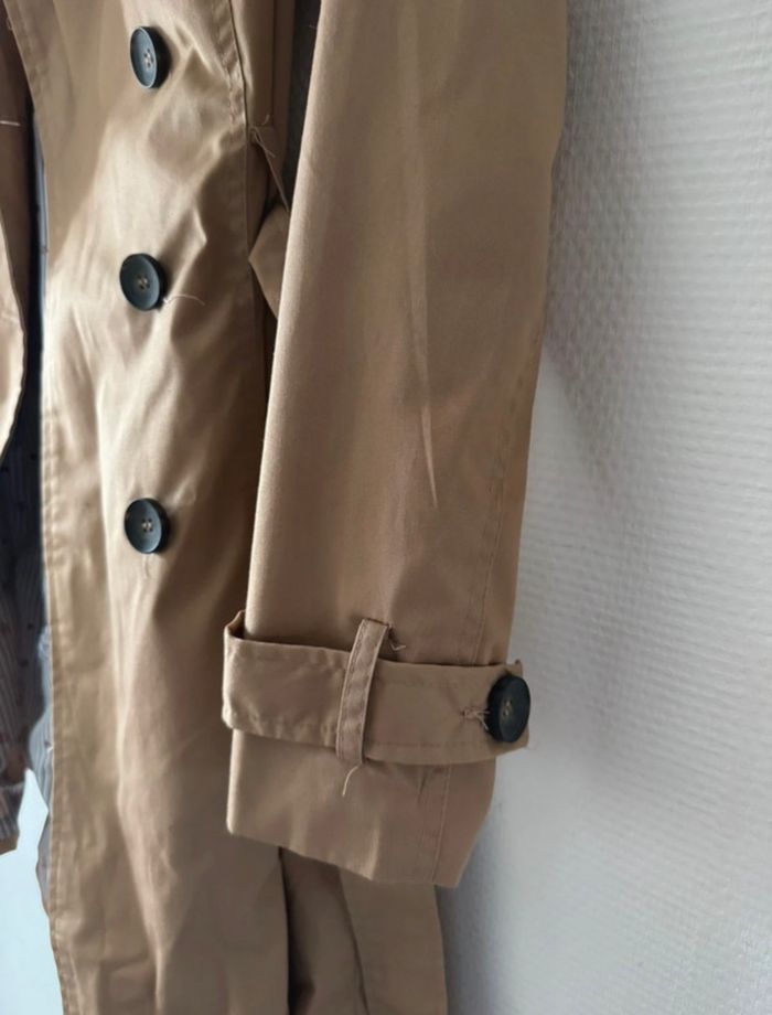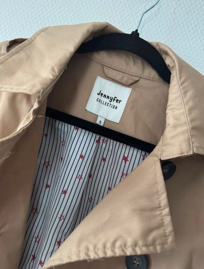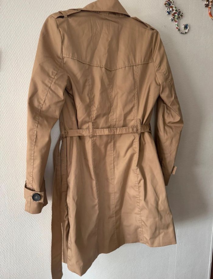 Trench classique beige de la marque Jennyfer, taille S. Jamais porté, état neuf Coupe mi-longue avec boutonnage croisé et ceinture assortie pour marquer la taille. Doublure intérieure à rayures et étoiles, très jolie finition. Idéal pour la mi-saison, le printemps ou l'automne Style chic et intemporel, tacile a assortir avec un jean, une robe ou un pantalon habille. Vendu car trop petit pour moi. Taille: S Couleur : beige État : Neuf, jamais porté Envoi rapide et soigné