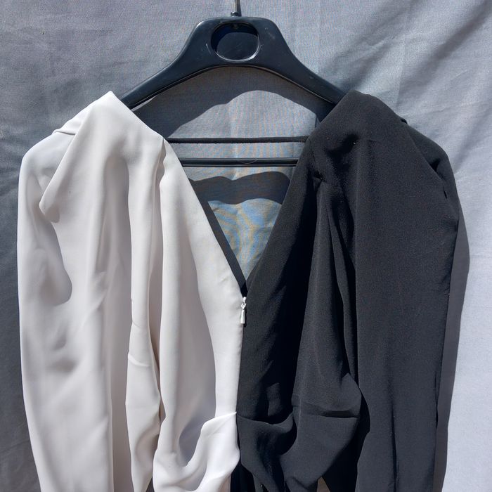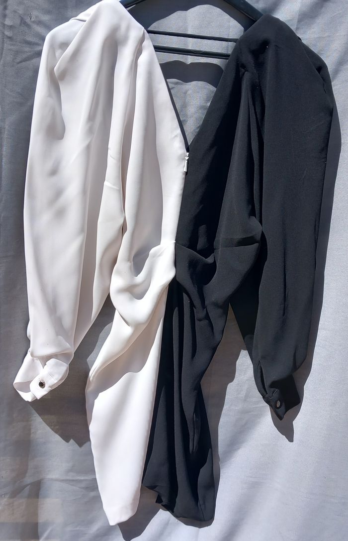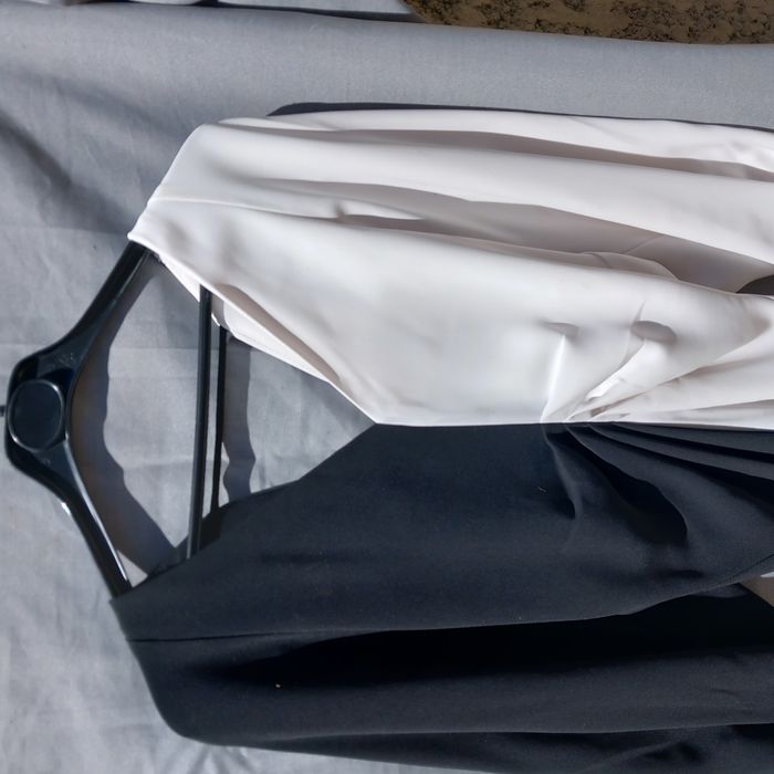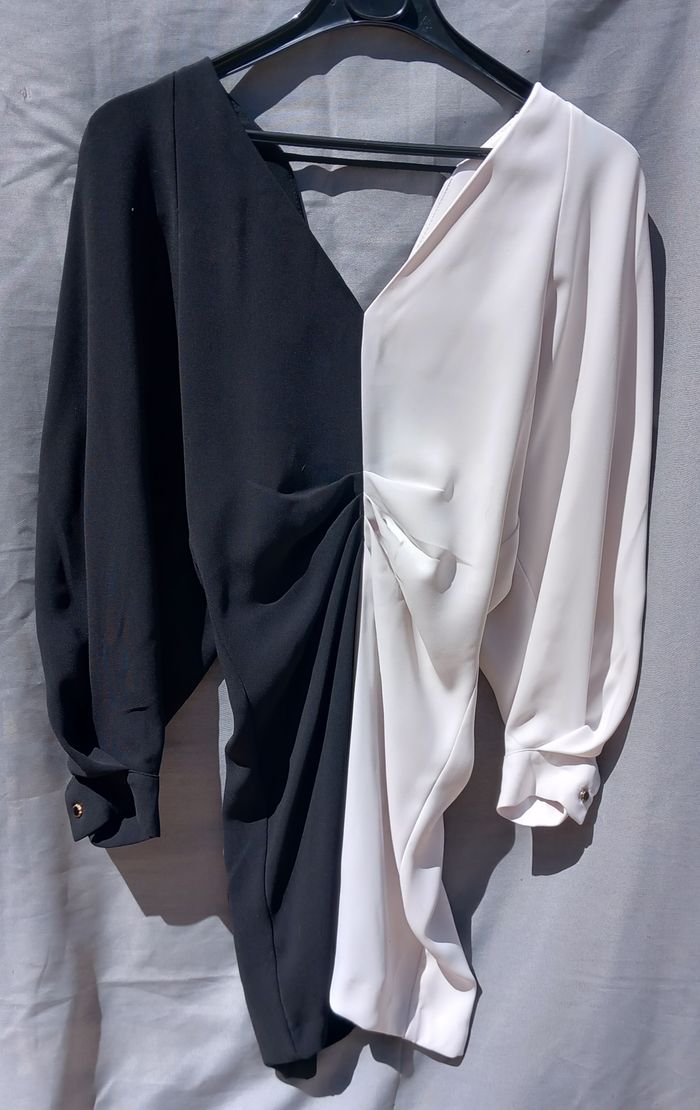 Robe Mango, manches longues avec bouton, zip au dos, tissu satiné bicolore noir et écru, effet plissé devant et dos pour un joli effet, 100% polyester largeur épaules 36 cm - aisselles 46 cm, longueur épaule-bas = 84 cm et aisselle-bas = 63 cm, longueur manches 61cm Possibilité d'offre en lots. Envoi rapide et soigné