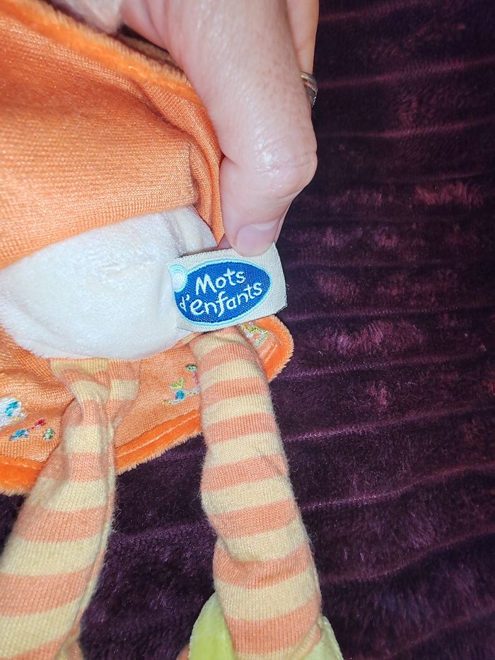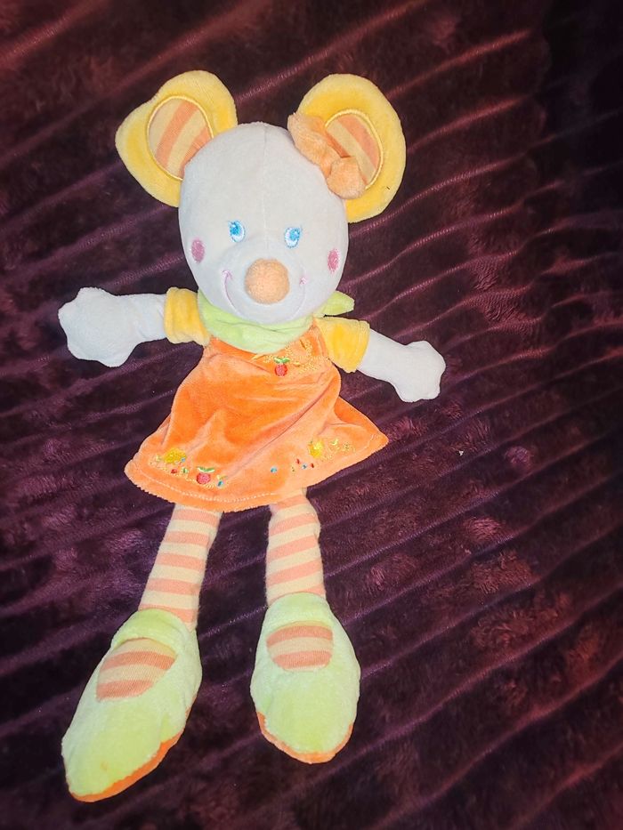 Mots D'enfants Doudou Souris Robe Orange Jaune Vert Blanc Bandana Broderie Pomme Poussin Tbe Étiquette marque présente 9.90 euros Envoi en relais
