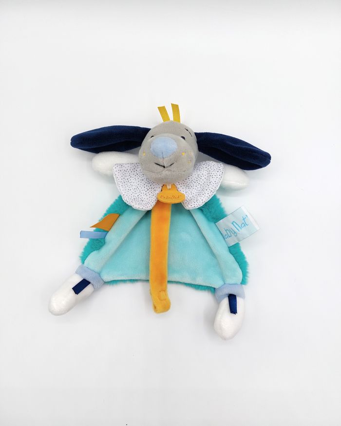 Doudou plat chien gris bleu Pépin BABY NAT BN0446 vert attache tétine jaune Comme neuf, il n'a pas servi de doudou - pas d'emballage ni étiquette Envoi rapide 👋 Vendeur professionnel – articles soigneusement sélectionnés, nettoyés et vérifiés avant expédition. Le prix est ferme, merci de votre compréhension A12646 #bebe #bébé #doudou #babynat #chien