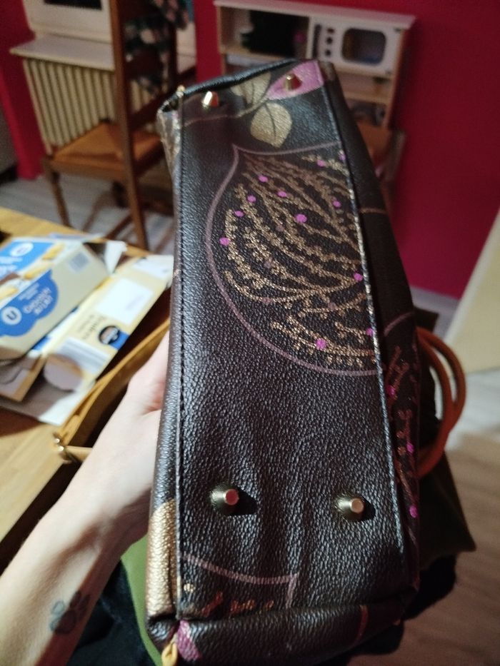 Très beau sac neuf jamais porté, avec motif fleurs et feuilles dorés et violettes. 3 grandes poches avec un petit à l' intérieur avec fermeture. Peut se porter en bandoulière ou à main.