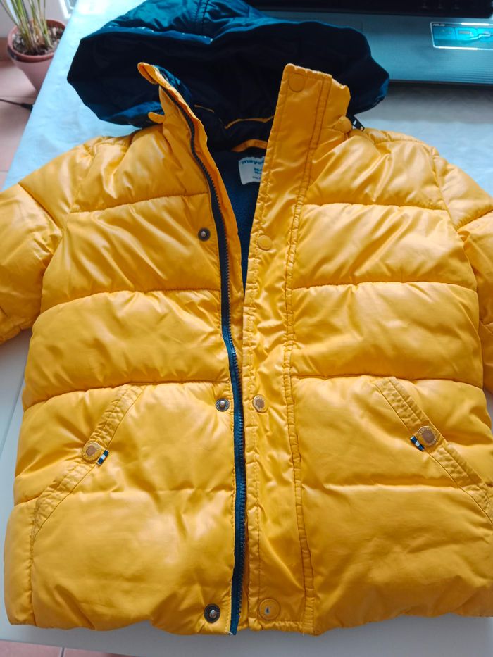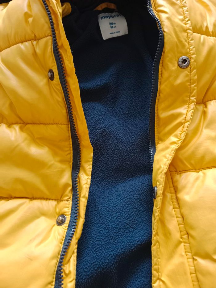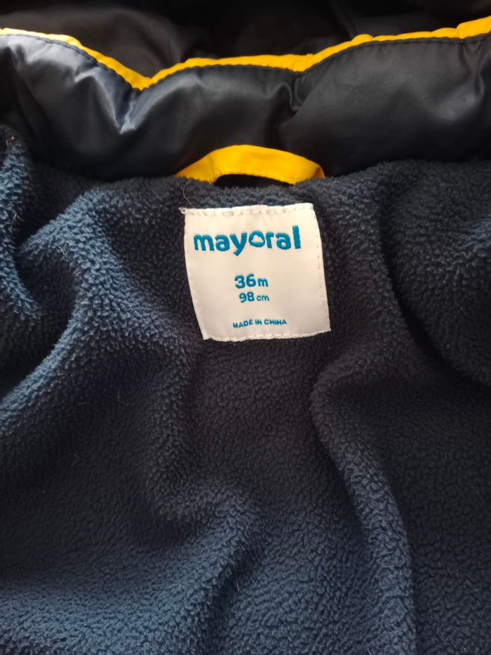 manteau bien chaud garçon Marque Mayoral 36 mois intérieur en polaire la peinture des boutons est un peu écaillée capuche amovible par fermeture éclair 2 poches devant avec bouton pression en très bon état