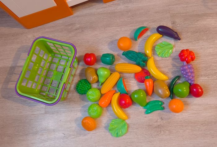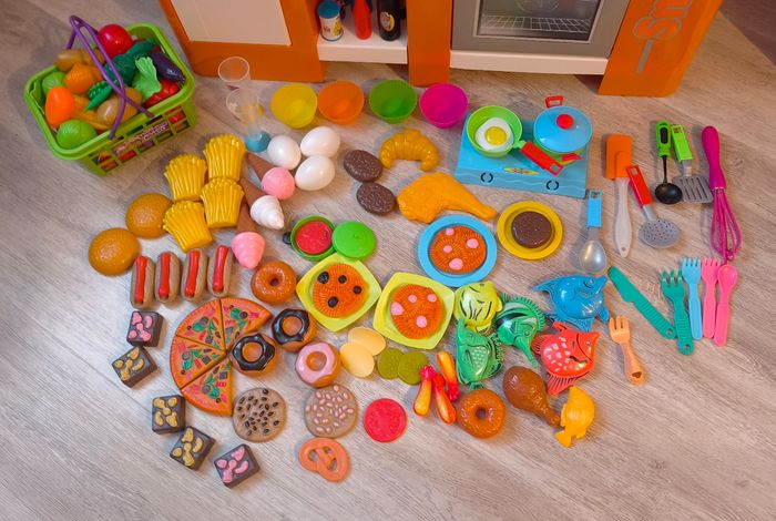 - Accessoires inclus: couverts, aliments, soda, capsules à café, panier à fruits et légumes…