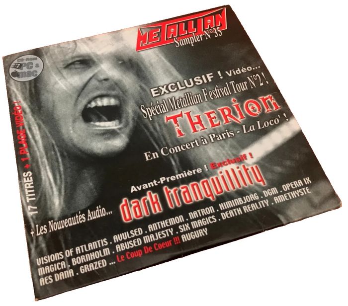 CD Métallian Sampler N°35 Thérion (2004) Metallian Editions MECD35 Poids : 23grs 1 Dark Tranquillity– Through Smudged Lenses 4:11 2 Visions Of Atlantis– Lost 3:51 3 Bornholm– ...On The Way To The Hunting Moon 4:55 4 Anthemon– Manfold Of... 4:59 5 Opera IX– In The Sixth Tower 4:48 6 DGM (3)– Through My Tears 4:34 7 Abused Majesty– A Burning Army 3:58 8 Augury– Geatus 4:03 9 Six Magics– Chaos And Fury 3:57 10 Natron– House Of Festering 2:11 11 Himinbjorg– Les Strates 4:27 12 Death Reality– Bloodprints 3:42 13 Amethyste– I Am 3:10 14 Magica (2)– A New Paradise 3:20 15 Grazed– Laughing To Death 3:00 16 Aes Dana (2)– Formors - Exil 4:54 17 Avulsed– Gorespatted Suicide 3:48 Video Therion– The Invicible 5:00