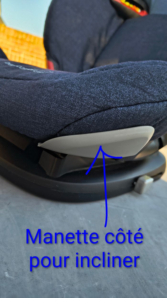 🔹 Siège confortable, inclinable (manettes en bas sur les côtés) et réglable en hauteur (manette en haut du dossier).