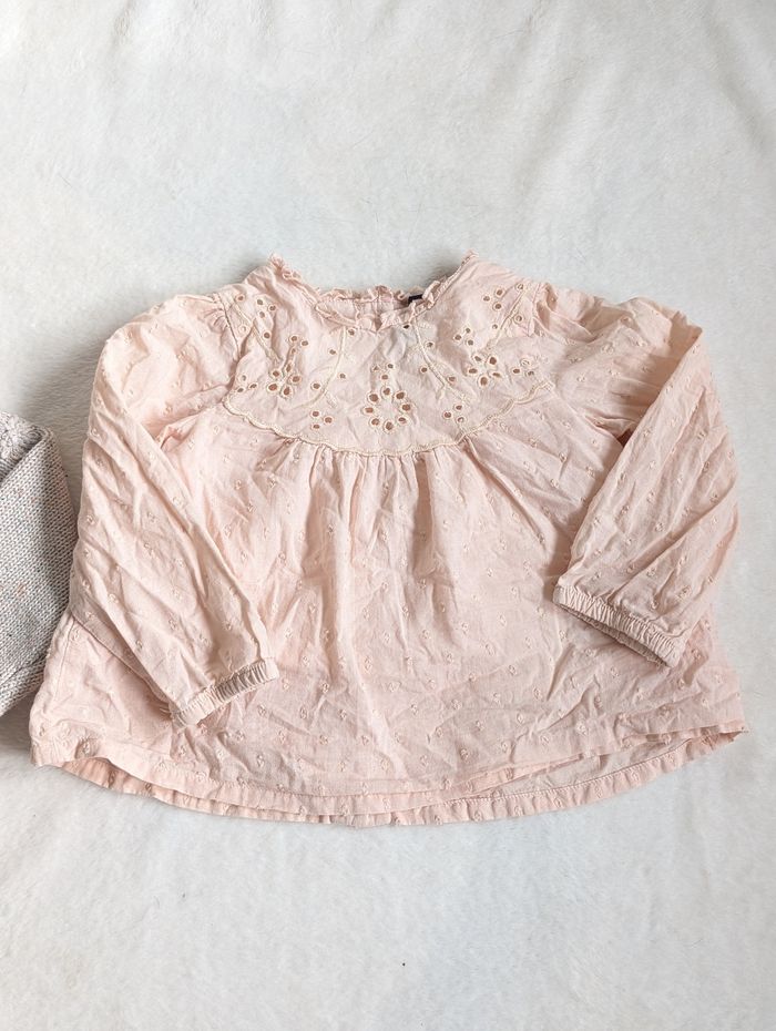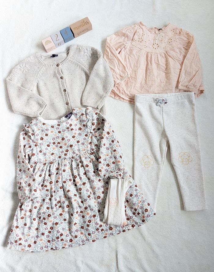 - Collant assortie a la robe neuf, jamais portés juste lavé en taille 19/22 - Gilet en maille avec bouderies fleuris sur les épaules. Très bon état porté une fois - Blouse rose à volant avec manches resserrées et broderies anglaise Sur le buste. Très bon état portée une fois