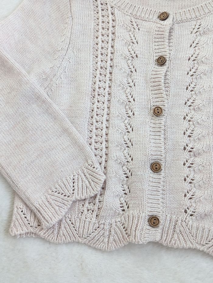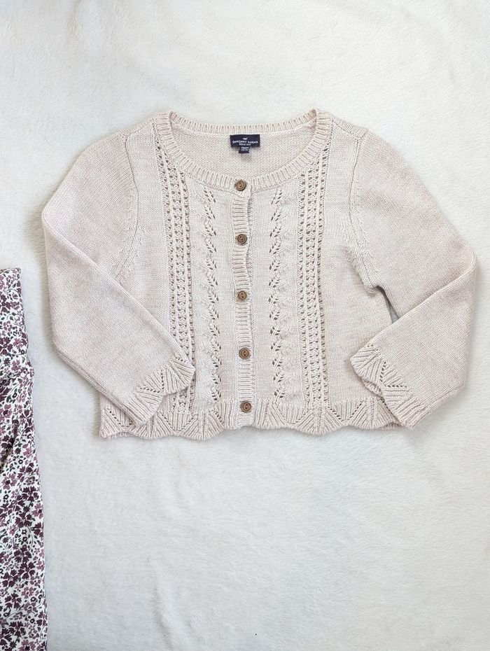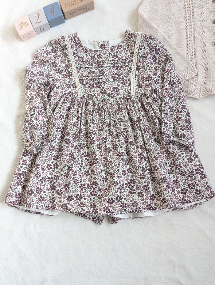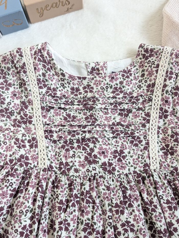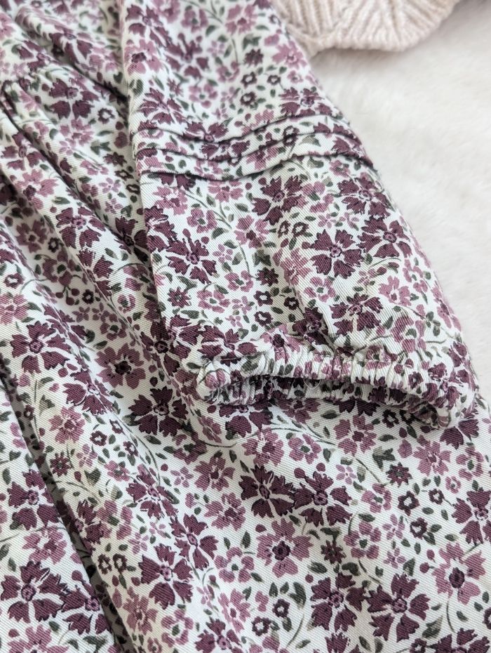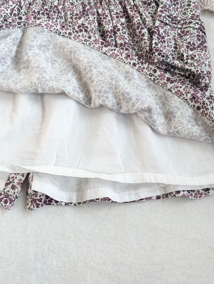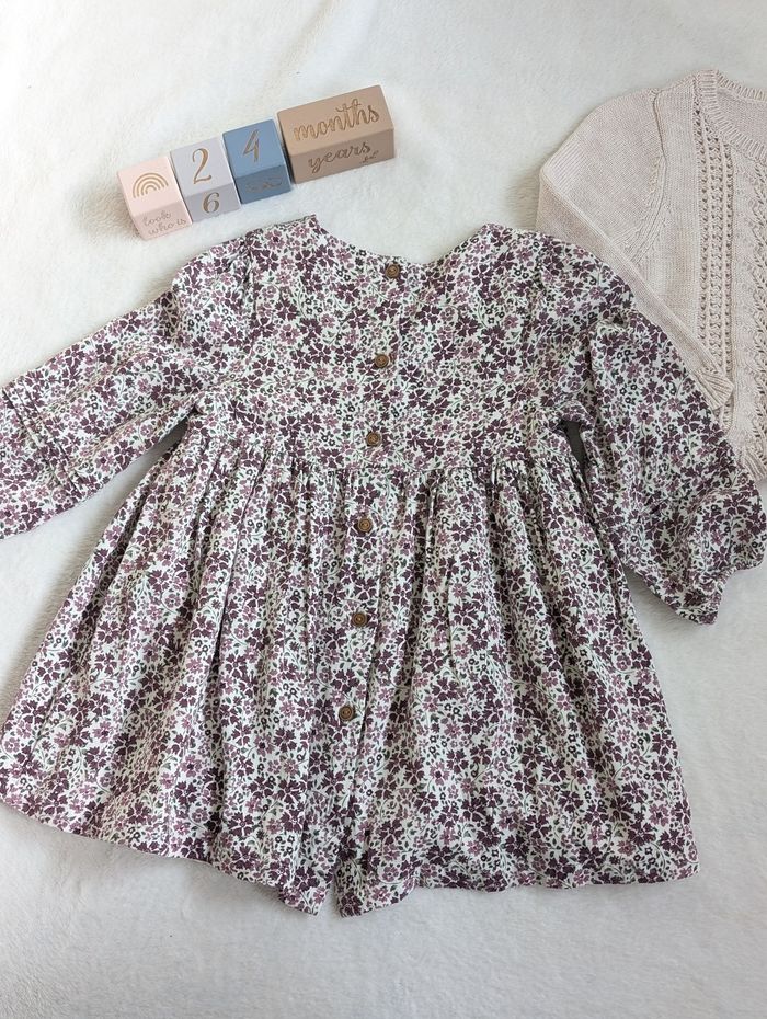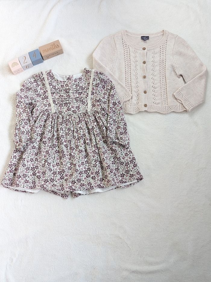 Description: Ensemble comprenant une robe à motifs fleuris et d'un gilet en maille ajouré beige. La robe et le gilet ont des boutons en bois.