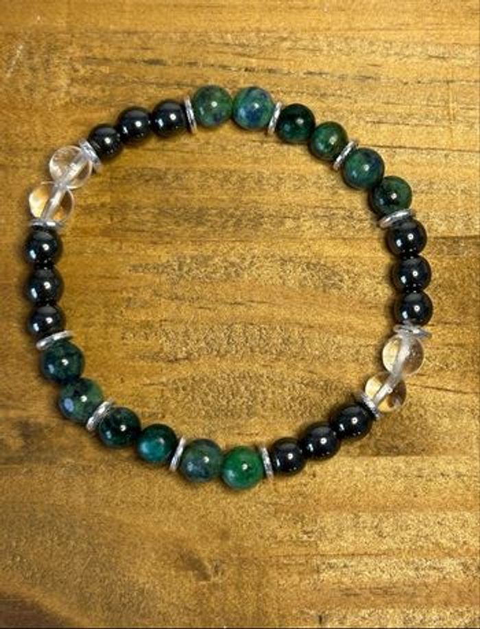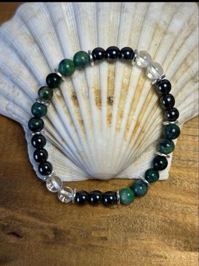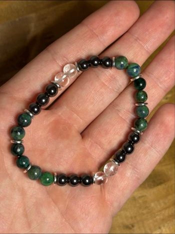 Composé de malachite, azurite, hématite et cristal de roche, il agit sur le corps et l'esprit en réduisant les tensions physiques, en apaisant les douleurs et en renforçant l'énergie vitale pour restaurer l’équilibre.
