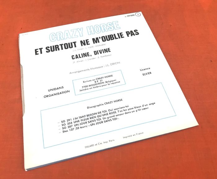 Vinyle 45 tours Crazy Horse Et surtout ne m' oublie pas (1973) Disque AZ 29000 A Et surtout ne m'oublie pas Written-By – J.L. Drion*, L. Valdi*, Michaële* 3:05 B Caline, Divine Written-By – E. Rombeau*, J. Donder*, P. Alvan* 3:06