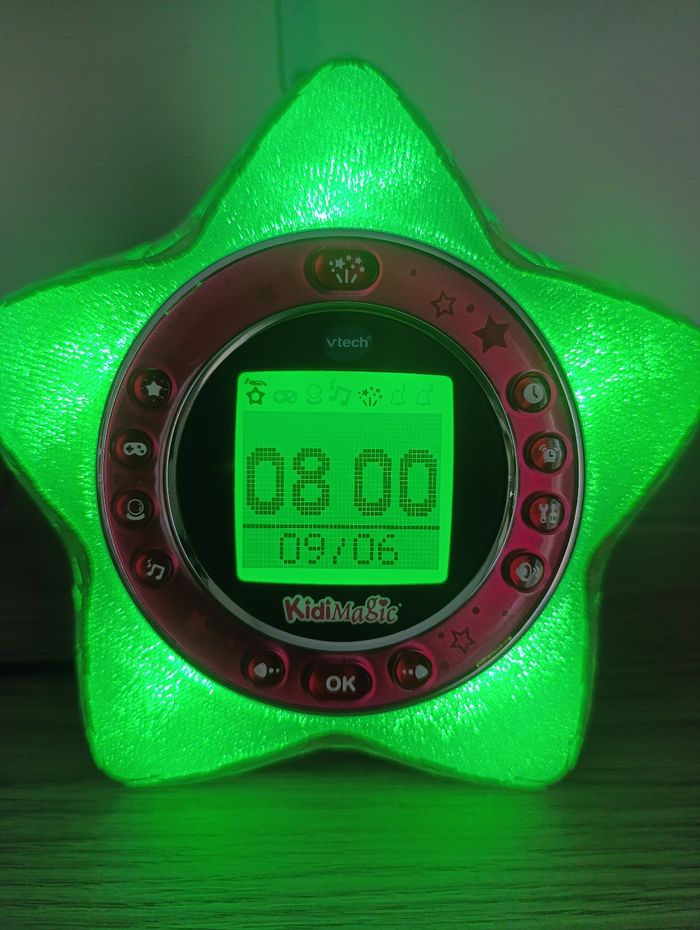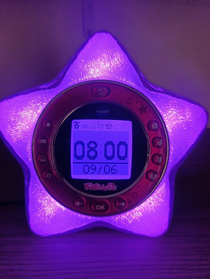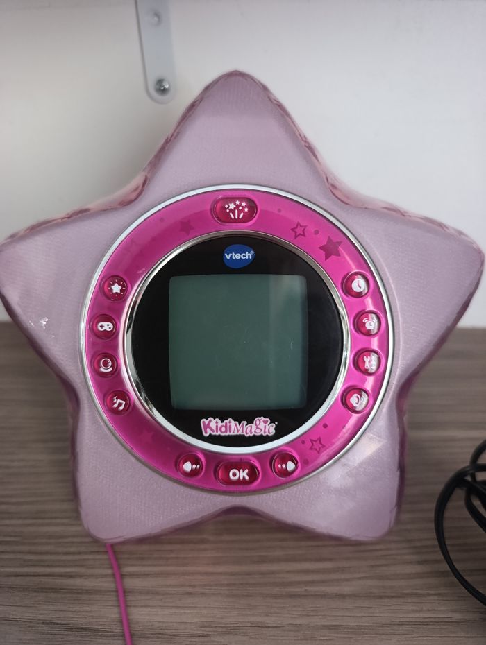 KidiMagic StarLight (rose) - 6 - 12 ans Un nouveau look en forme d’étoile ! Détection de mouvement : il suffit de passer la main au dessus de l’étoile pour la voir changer de couleur comme par magie ! La couleur de l’étoile varie grâce aux effets de lumières douces et magiques. 7 variations de couleurs différentes et 12 effets lumineux. Magique ! Grâce à la projection animée, la petite fille découvre l’heure entourée d’étoiles scintillantes ou de fleurs. Fonction horloge parlante, réveil et radio. Un écran rétroéclairé avec plus de 10 thèmes pour personnaliser son écran. 8 jeux dont 5 jeux de voyance magique inclus ! Le KidiMagic Starlight lit dans les pensées et découvre en quelques secondes la carte ou le dessin choisi par l’enfant. 6 mélodies et des sons de la nature relaxants. Fonctionne avec 4 piles LR6 ou adaptateur secteur fourni (acheté séparément 17€)