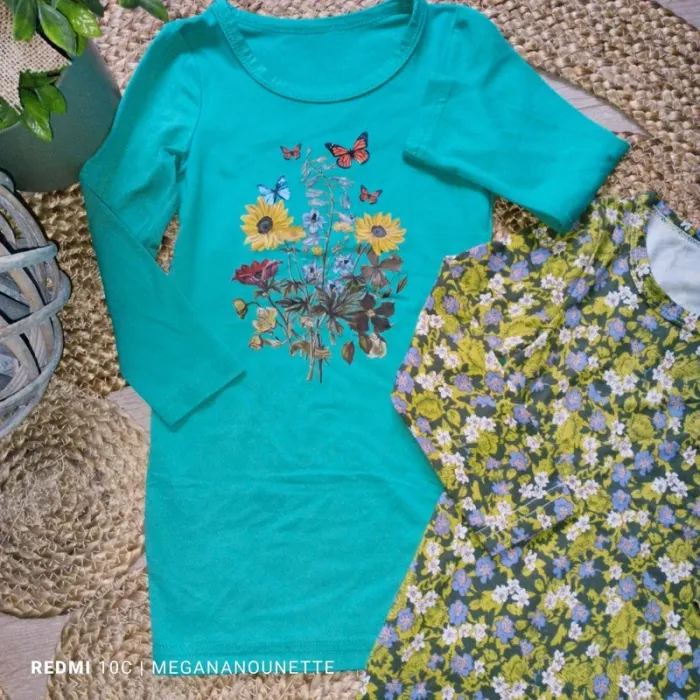 👗 Robe 1 : Turquoise/Verte avec imprimé central de fleurs et papillons 🦋🌻. Tissu léger, coupe droite, parfaite pour les journées ensoleillées ou les balades en famille 🌞