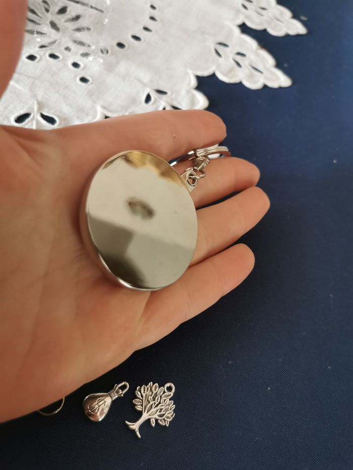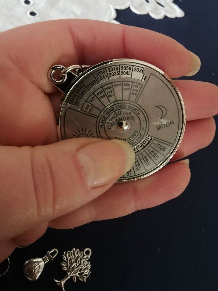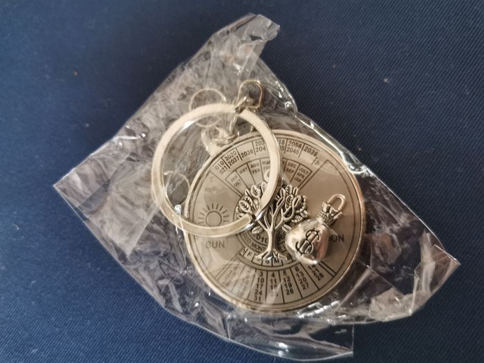 Porte-clés en métal mini-calendrier perpétuel, neuf, en métal argenté avec des petits charmes : arbre et bourse. Diamètre : 4 cm, poids 26g.