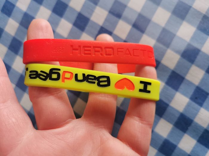 Lot de 2 bracelets en caoutchouc jaune et rouge, le lot n'est pas dissocciable et comprend un braclet jaune I ❤️bandgee. com et un bracelet rouge hero factory, ils sont en très bon état général, le tour de poignet fait 19 cm, le poids 6g.
