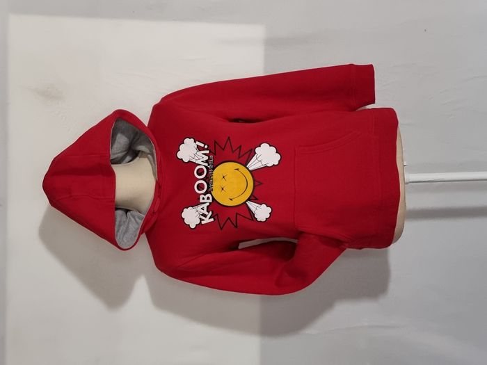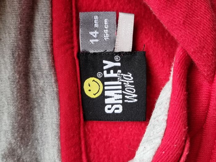 Pull garçon Smiley world rouge avec motif smiley en daim jaune taille 14 ans. Avec poche ventrale et taille grand (le mannequin fait du S). Neuf sans étiquettes. Envoi rapide et soigné. Négociable.