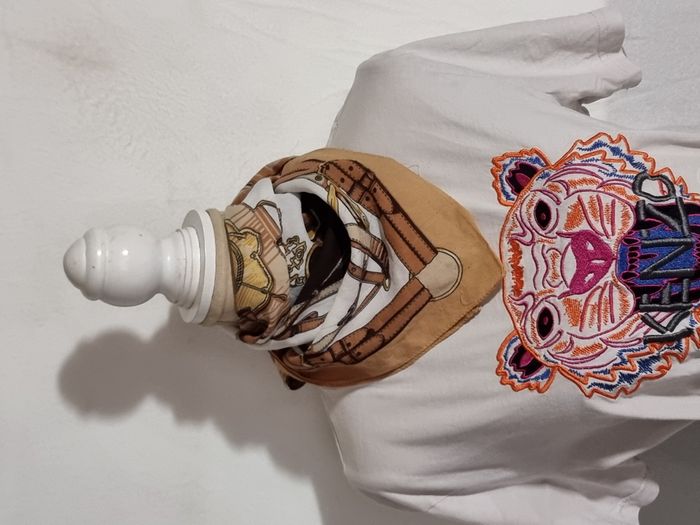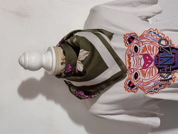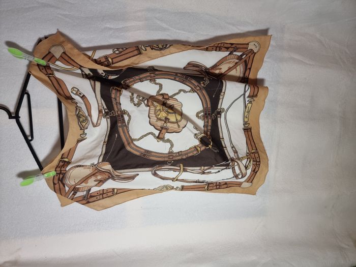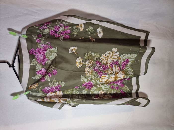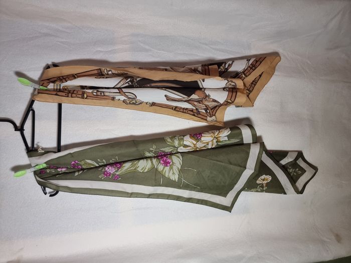 Lot de 2 foulards carrés : - 1 kaki à fleurs roses et blanches en très bon état. - 1brun clair et blanc avec motif en état satisfaisant. Envoi rapide. Négociable.