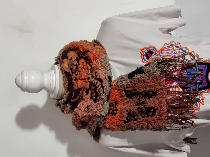 Echarpe femme marron, gris et orange motif papillons et feuille longue de 200 cm. En bon état. Envoi rapide et soigné. Négociable.