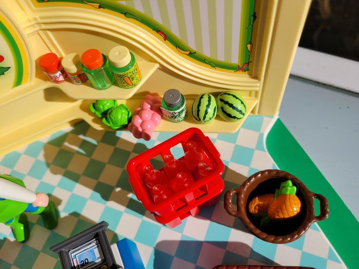 PLAYMOBIL ÉPICERIE 9403 C'est combien le kilo ? Demande la cliente à l'épicier. « Allez, je vous fais un prix comme vous m'avez aussi acheté des œufs » répond l’épicier. L'épicerie propose tout ce qu'il faut pour préparer le repas. Les cagettes pleines de fruits et légumes frais donnent des idées de bons petits plats aux clients. Le primeur va pouvoir paser de villages en villages, vendre sur le marché grâce à son camion équipé d'étagères et éviers (il n'y a pas d'accessoires dans les camion) En très bon état Mes autres playmobils : #playmobilmooglou