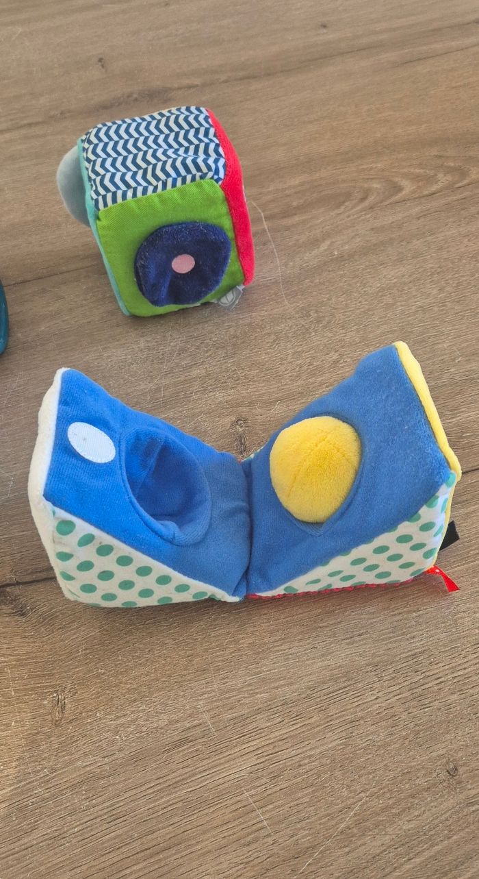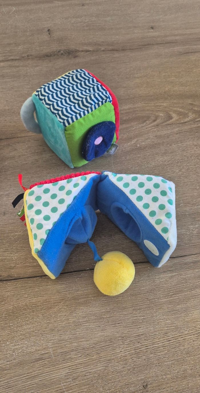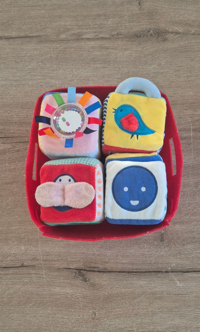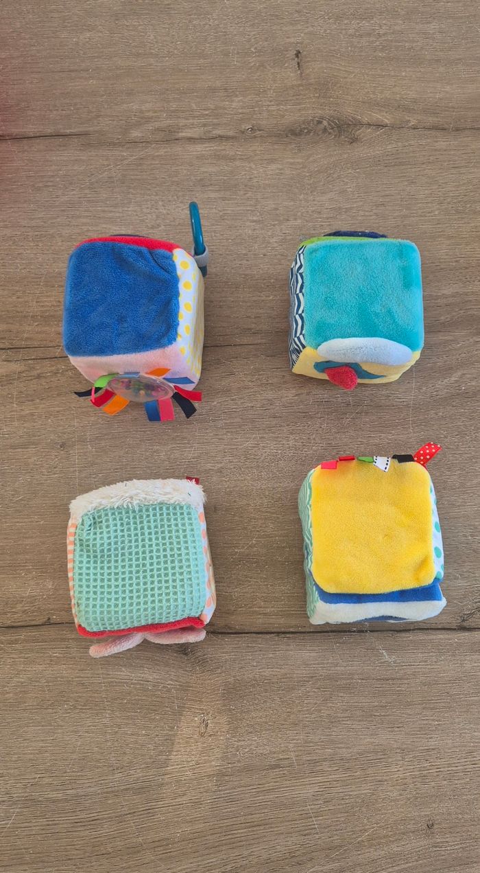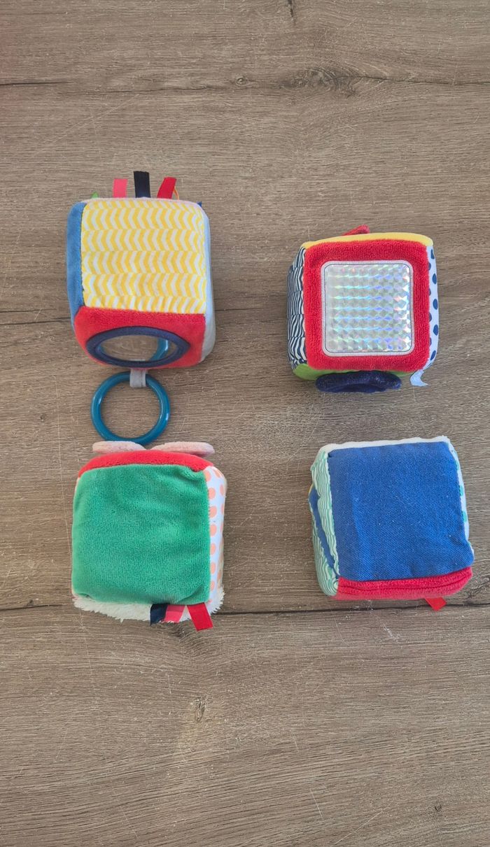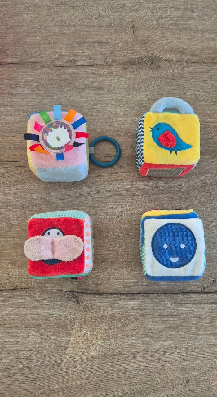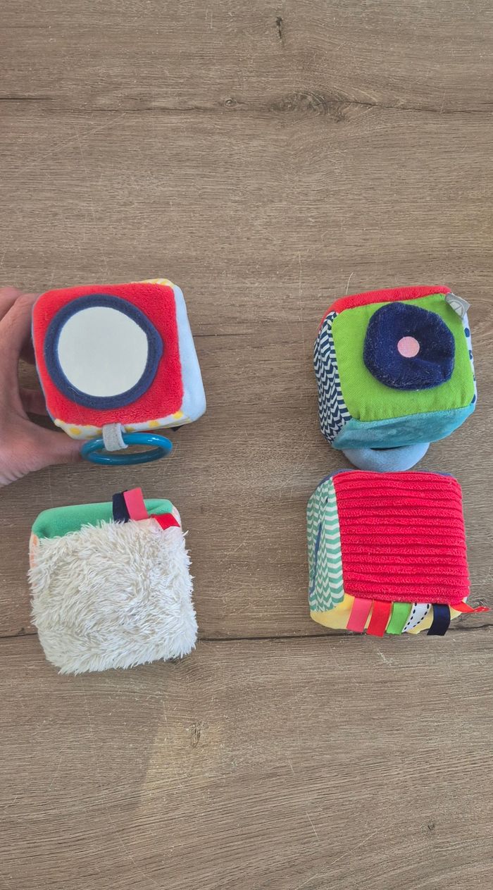 4 cubes d'éveil en tissus avec matières et textures différentes Bruit de papier bruissant, hochet à billes, miroir, étiquettes et cube surprise qui s'ouvre avec grelot intérieur Oxybul Très bon état