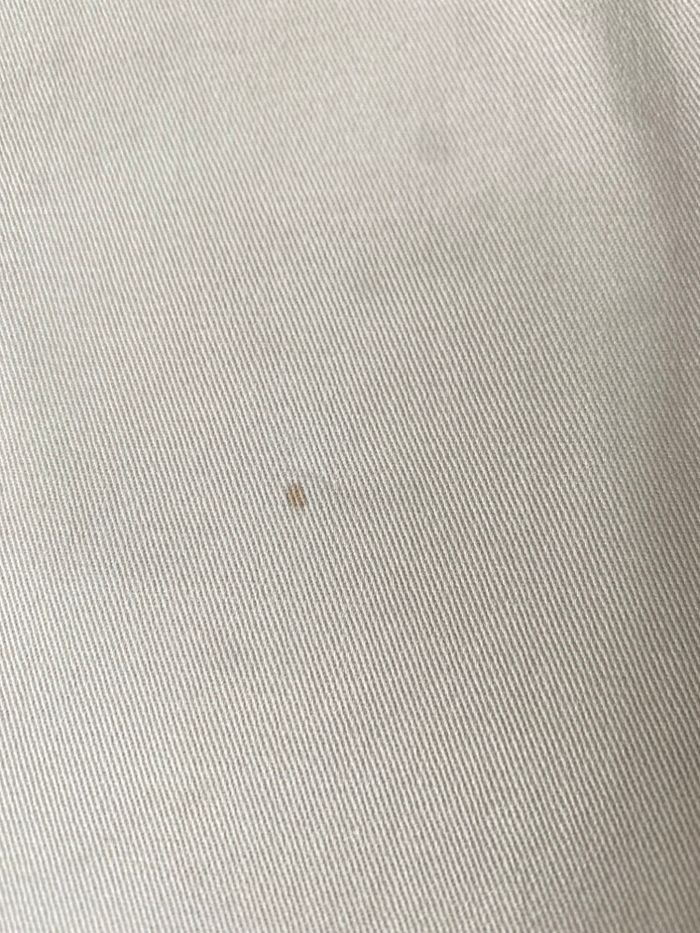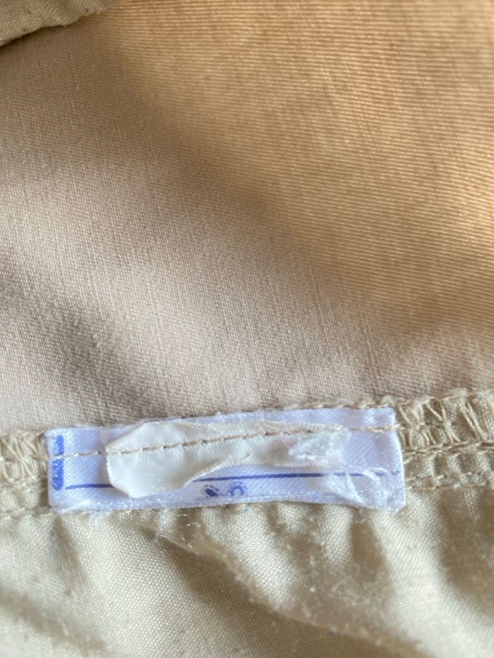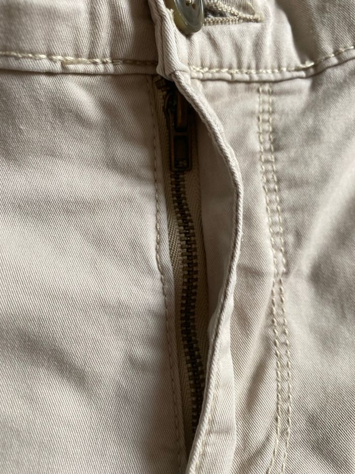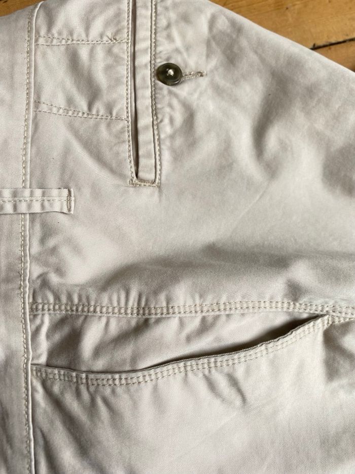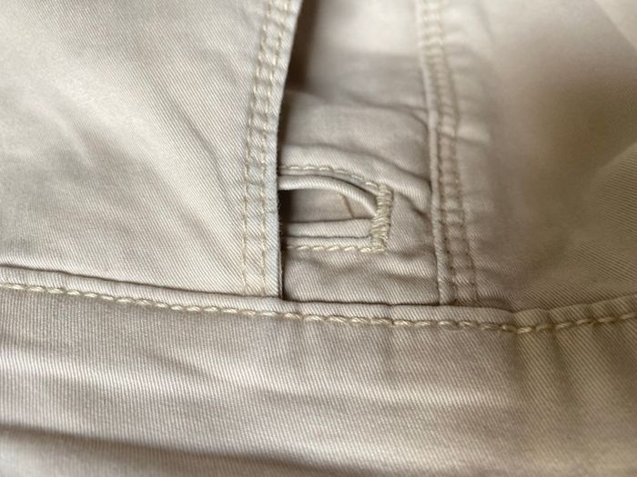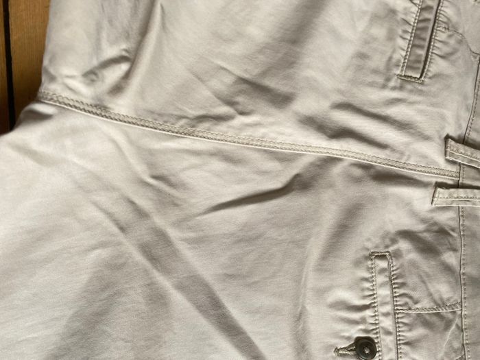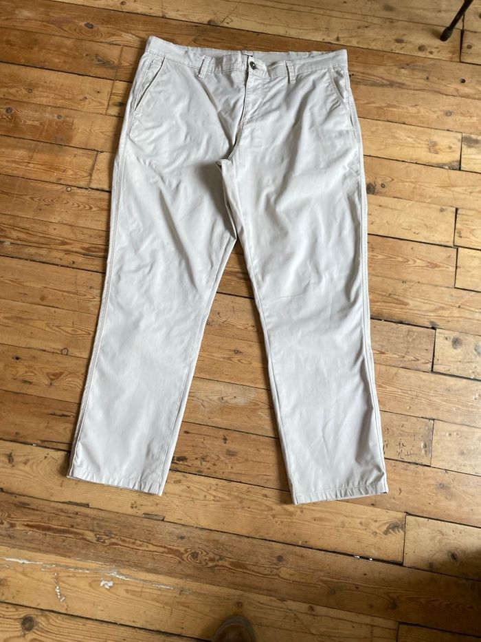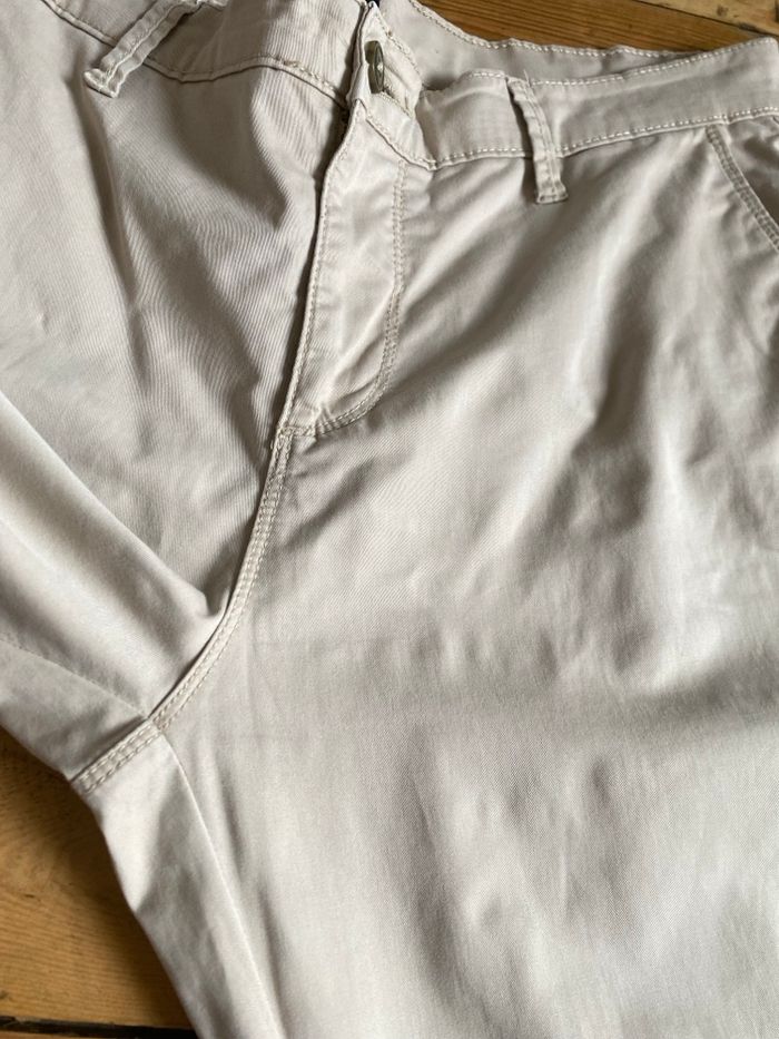 Pantalon chino slim fit beige 44 homme kiabi Plus d'étiquette de composition, vraisemblablement du coton elasthane Bon état car principalement une petite tache sur un genou, partira peut-être au lavage, je ne l'ai pas relavé. La ceinture Mesure à plat 49,8 cm Longueur entre jambe 72,2 cm Longueur côté 99,5 cm Largeur à plat bas des jambes 19,7 cm