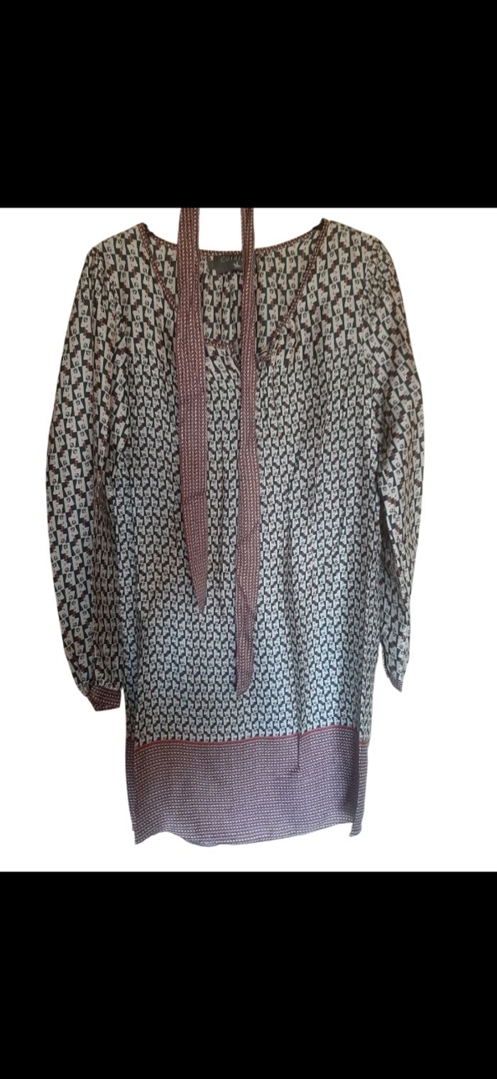 Robe à imprimé avec ceinture tissu (dessin de visages , de cœurs sur le bas et la ceinture) taille 1, bas des manches 1 bouton, décolleté arrondi avec 2 boutons.