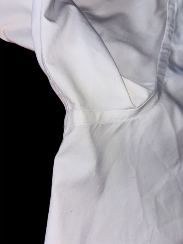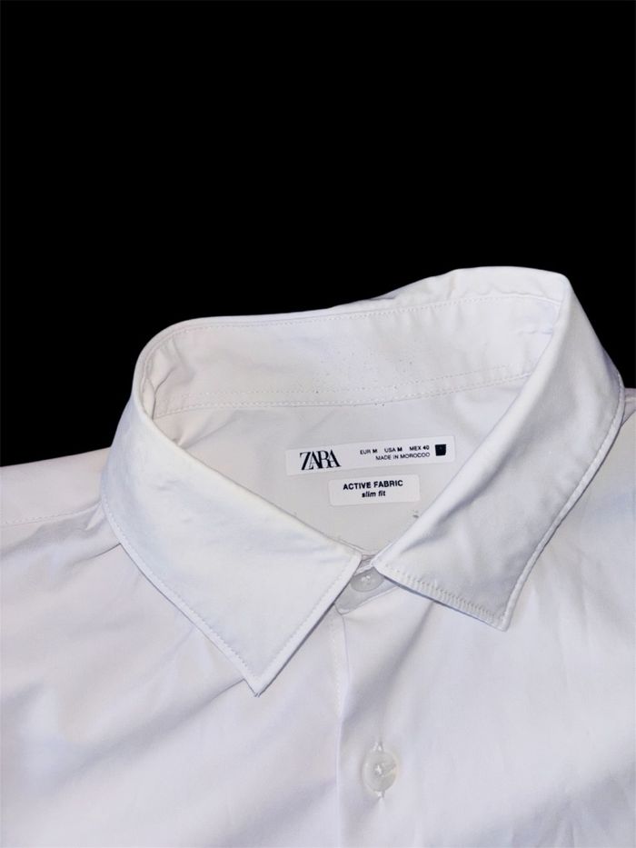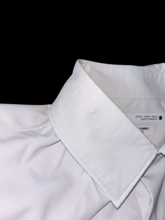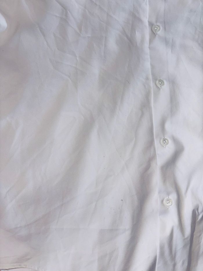 Chemise homme blanche slim fit Quelques traces noir sur le devant voir photo, et quelques traces bouloche sur le col Pas de trace au niveau des aisselles Tissu léger
