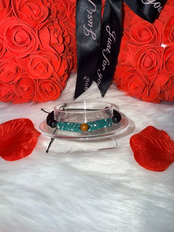 Bracelet au style bohème chic avec ses perles noires mates et son tressage turquoise orné d’une perle centrale marron.