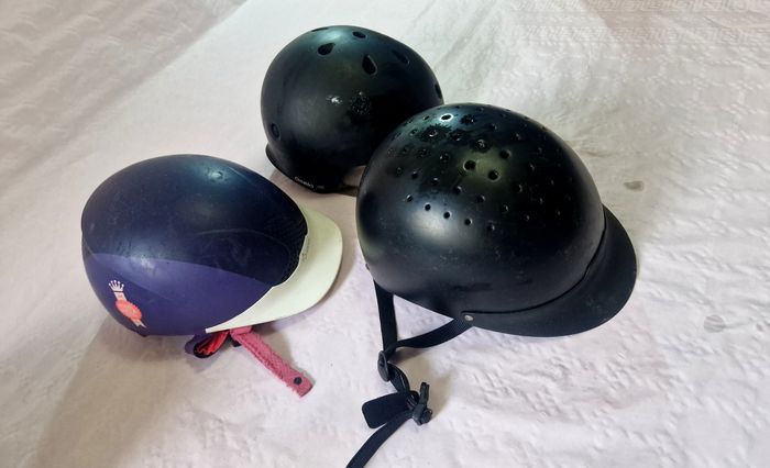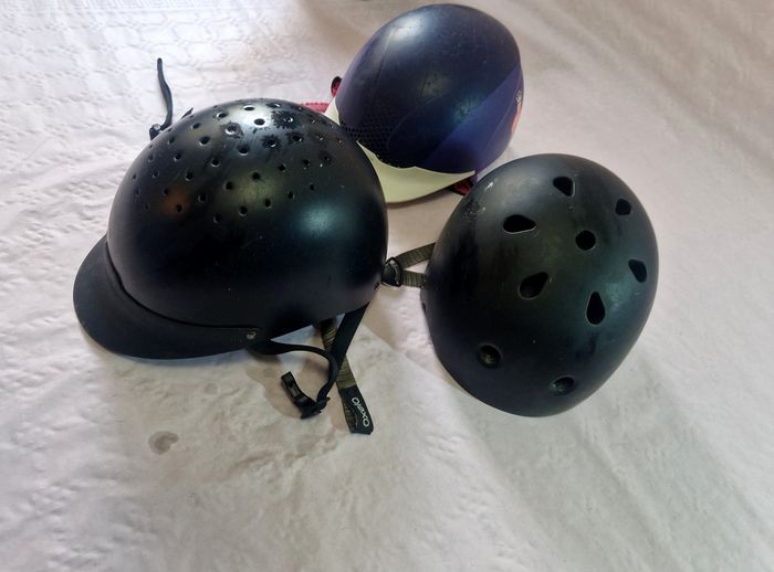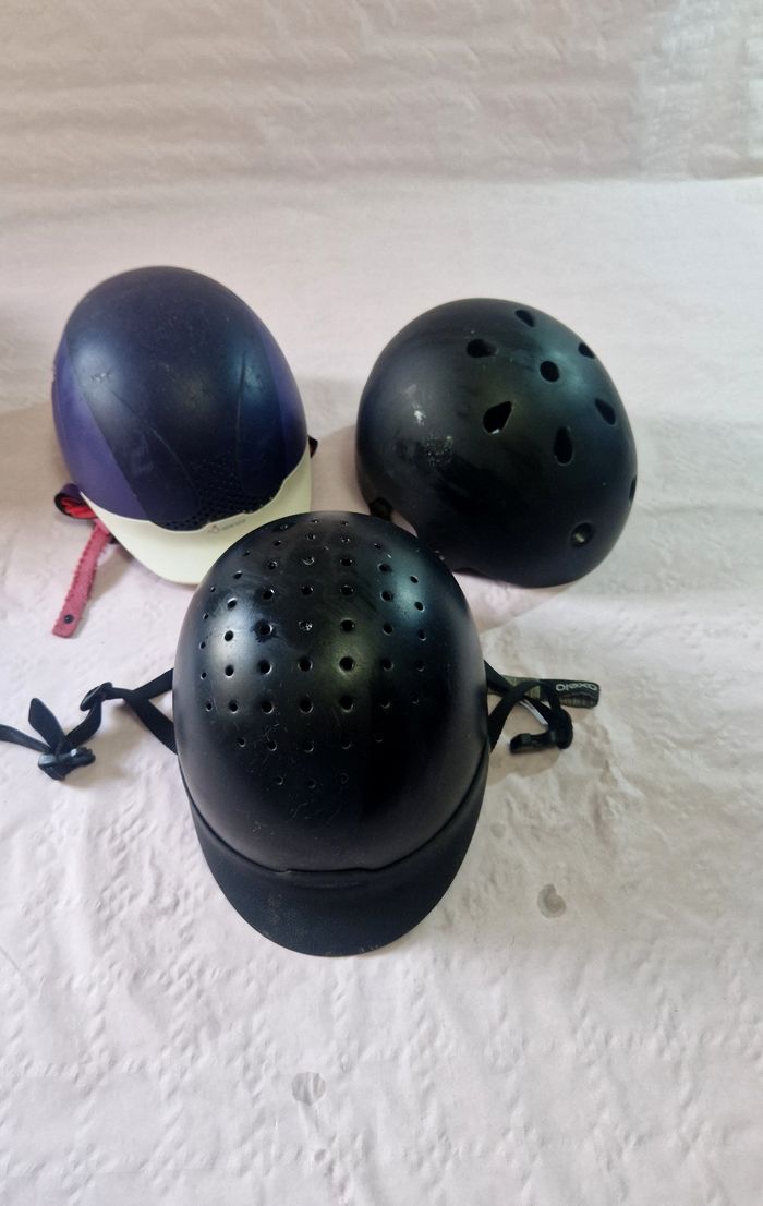 Bonjour , vend lot de 3 bombes / casque de protection équitation , taille de 51 a 55 cm , deja utilisé , ayant des marques d'utilisation , reste en bon état , idéal entraînement