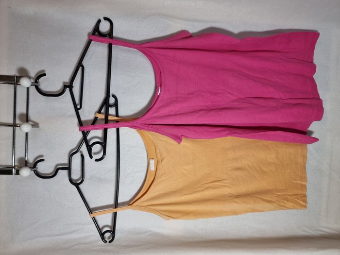 Lot de 2 débardeurs ficelle femme taille 40/42. - 1 abricot - 1 fuchsia En bon état. Envoi rapide et soigné. Négociable.