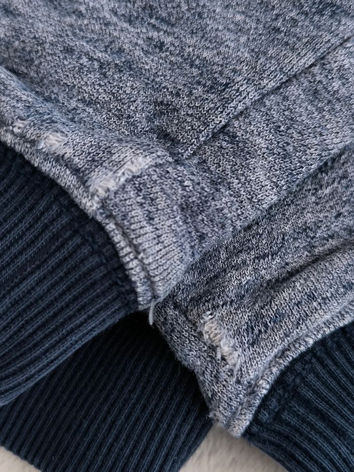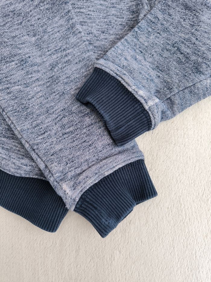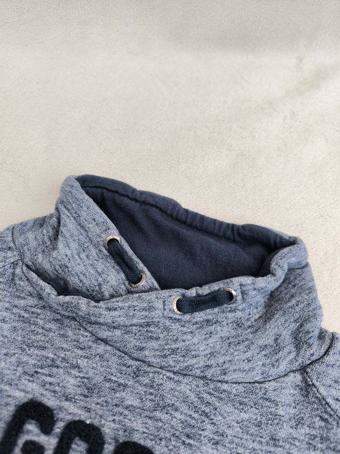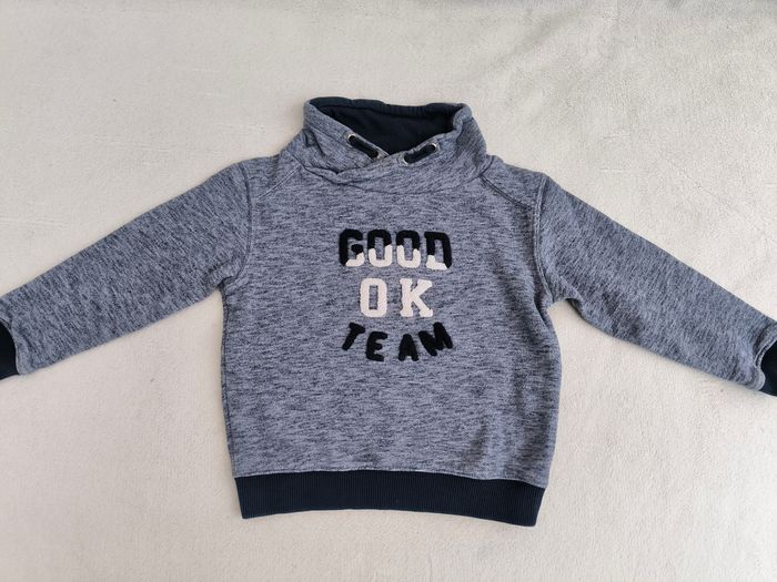 Sweat à manches longues Marque Okaïdi Taille 3 ans, 98 cm • Coloris marine, blanc • Inscription en texture "Good OK team" • Col montant • Intérieur légèrement molletonné • Coton • Bas des manches abîmés/effilochés En bon état #evelyne_garcons_3ans #evelyne_garcons
