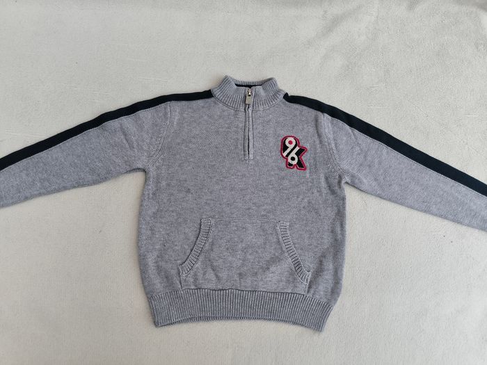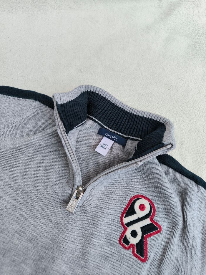 Pull à manches longues Marque Okaïdi Taille 3 ans, 98 cm • Coloris gris, marine • Broderie "96, OK" • Fermeture éclair au col • Poche ventrale, kangourou • Mailles • Coton Également disponible en marine Peu porté, en très bon état #evelyne_garcons_3ans #evelyne_garcons
