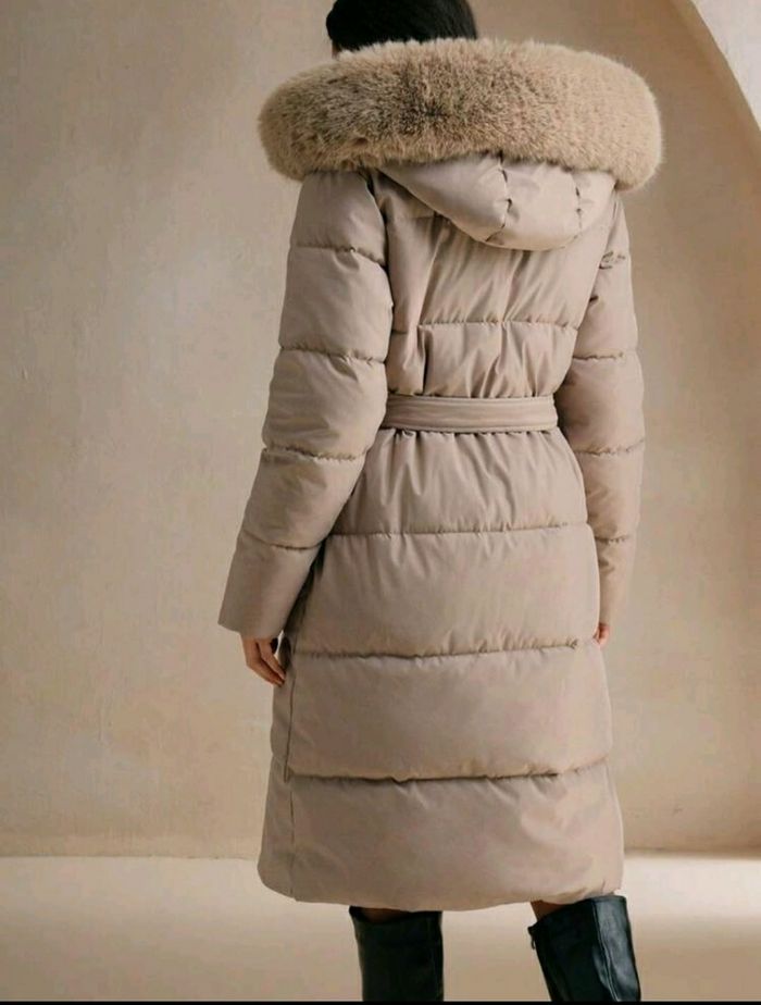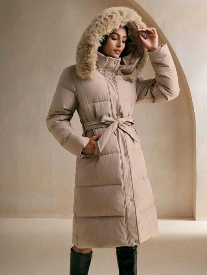 Manteau matelassé avec fermeture éclair et capuche pour femmes, à couleur unie kaki beige avec bordure en fausse fourrure détachable,