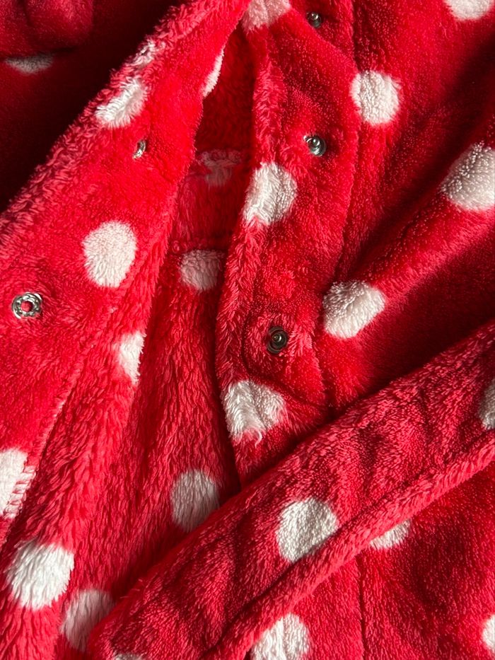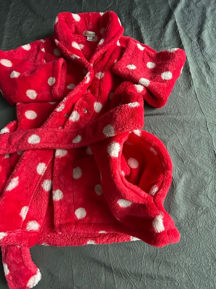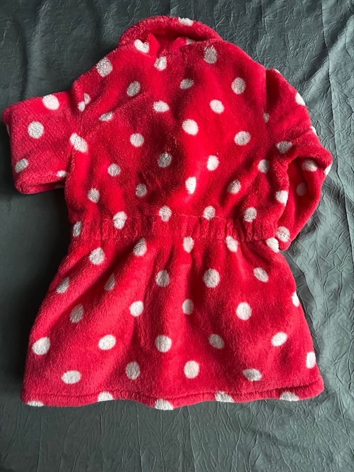 Jolie robe de chambre d'hiver pour petite fille de la marque Vertbaudet. Taille 24 mois. Couleur de Noël, rouge à gros pois blanc. Se ferme par boutons de pression et une ceinture. 2 poches côté. Matière toute douce. En très bon état.