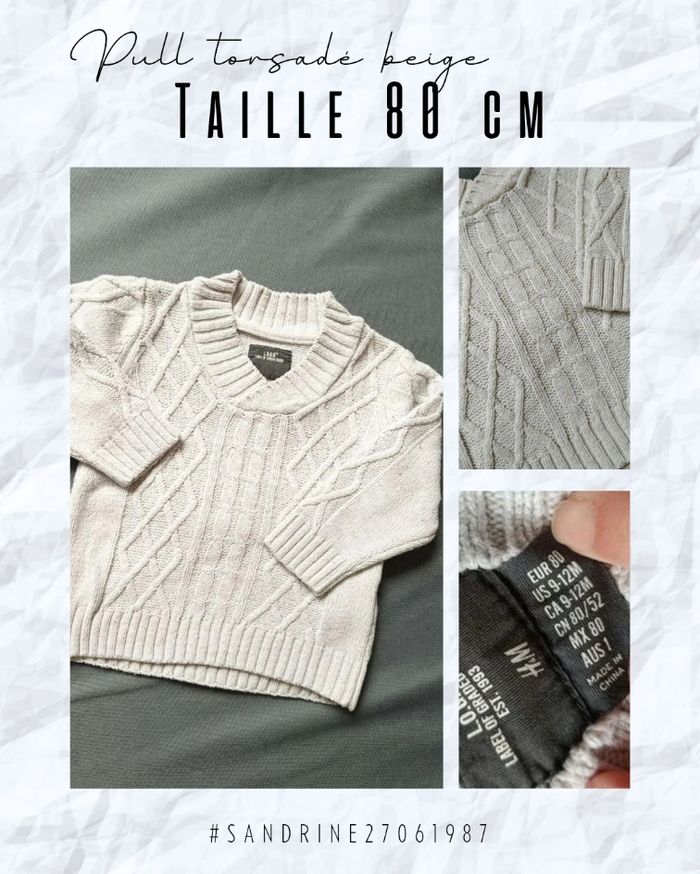 🧸Détail du vêtement 🧸 Pull torsadé de couleur crème. Très bon état. Taille 9/12 mois (80 cm). Marque H&M