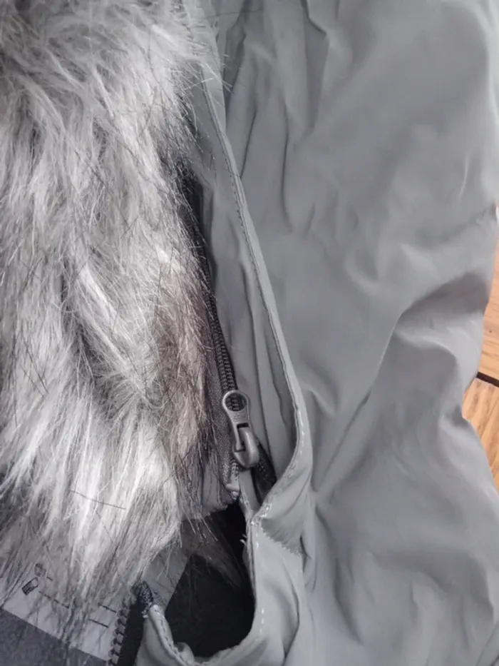 Doudoune neuve, fourrure amovible, intérieur chaud, couleur grise métallisée et noir