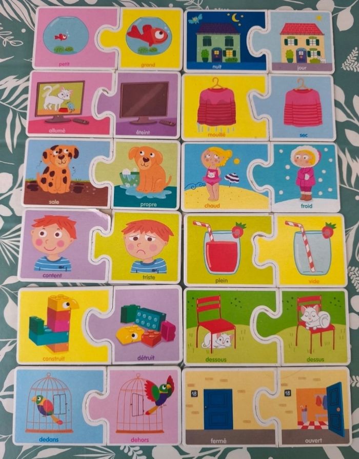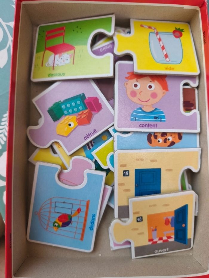 Jouet bébé dès 2 ans Les contraires : puzzle à assembler par paires de contraires Complet : 12 paires Dans sa boîte d'origine Très bon état général Pensez aux lots : réductions activées